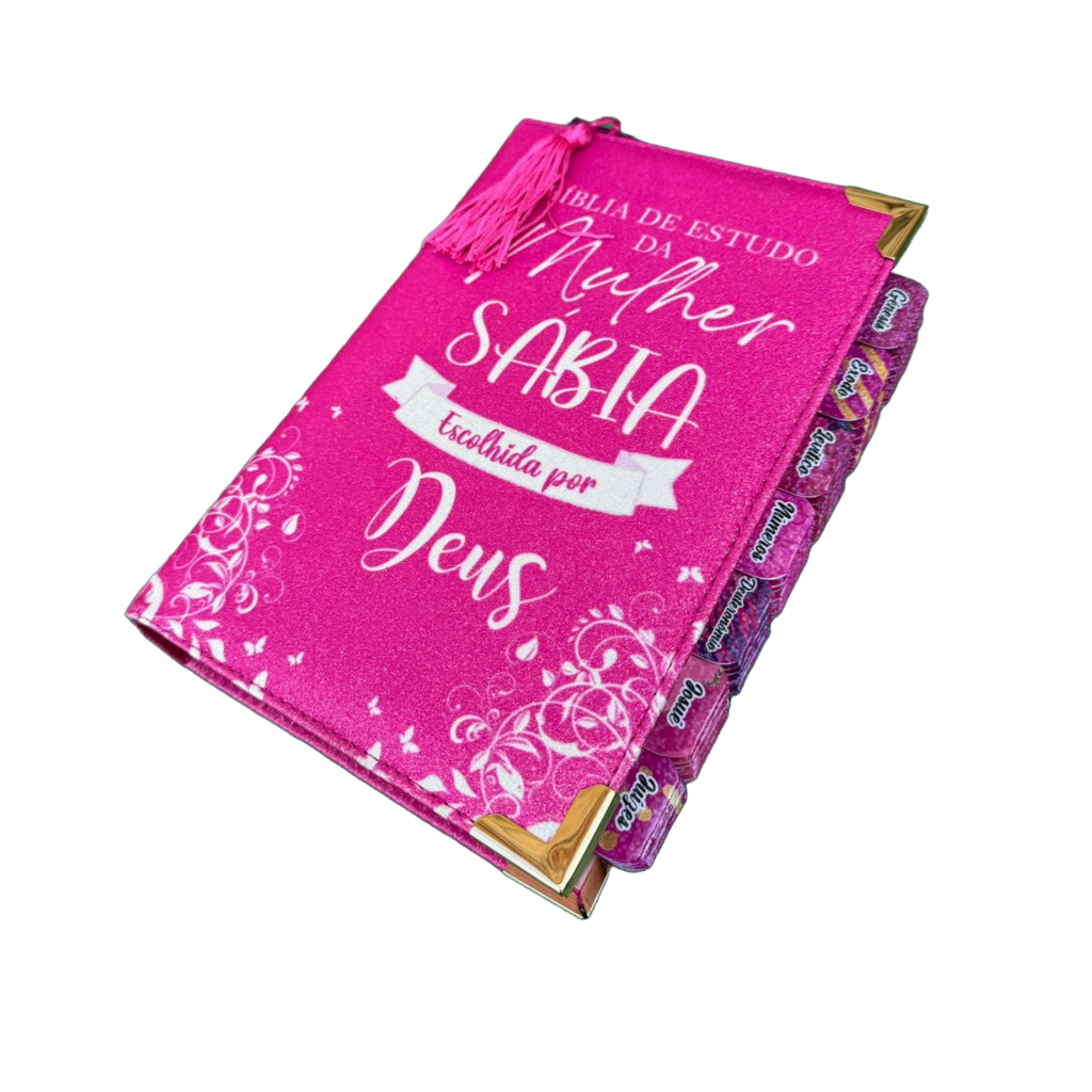 Bíblia da Mulher Sábia de Estudos 100% Glitter Pink Personalizada com Abas adesivas Hiper Full Color