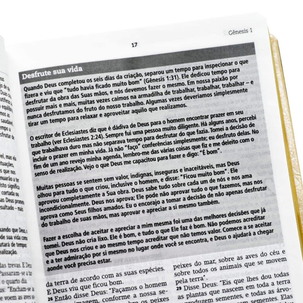 Bíblia Sagrada, com a linguagem na versão NVI (Nova Versão Internacional). Dentre as versões bíblia ela se torna uma das mais modernas e prezervando a clareza do texto, permanecendo fiel aos Escritos originais. Incluindo panorama bíblico e mapas. A Bíblia pode ser de difícil leitura e compreensão. Seu objetivo ao oferecer a você esta Bíblia exclusiva com suas notas e comentários é construir pontes sólidas entre as palavras da Bíblia e a sua vida diária. Joyce Meyer espera que a BÍBLIA DE ESTUDOS JOYCE MEYER o ajude a aplicar as verdades da palavra de Deus à sua vida através de suas contribuições, que incluem: INTRODUÇÃO AOS LIVROS, que incluem um breve relato no início de cada livro da Bíblia. PRINCÍPIOS PARA A VIDA, que traçam uma linha entre as palavras do texto e a experiência do leitor. ARTIGOS PARA A VIDA DIÁRIA, que se concentram em passagens específicas e trazem a percepção e os ensinamentos de Joyce. COLOCANDO A PALAVRA EM AÇÃO, que traz algumas das perguntas diretas de Joyce para incentivar a reflexão, e em seguida, a ação. DECLARE A PALAVRA, que apresenta versículos adaptados para serem feitos como orações individuais de confissão, trazendo as promessas da Bíblia para um nível totalmente novo e pessoal. A abordagem simples e direta de Joyce em relação à vida tornou-a admirada por muitos como mestra, mentora, e amiga. Ter acesso a seus pensamentos e ensinamentos ao estudar a Bíblia dará uma nova dimensão às palavras de vida e você se sentirá como se tivesse a própria Joyce Meyer como sua companheira de estudos. 1679 Páginas 14x21cm