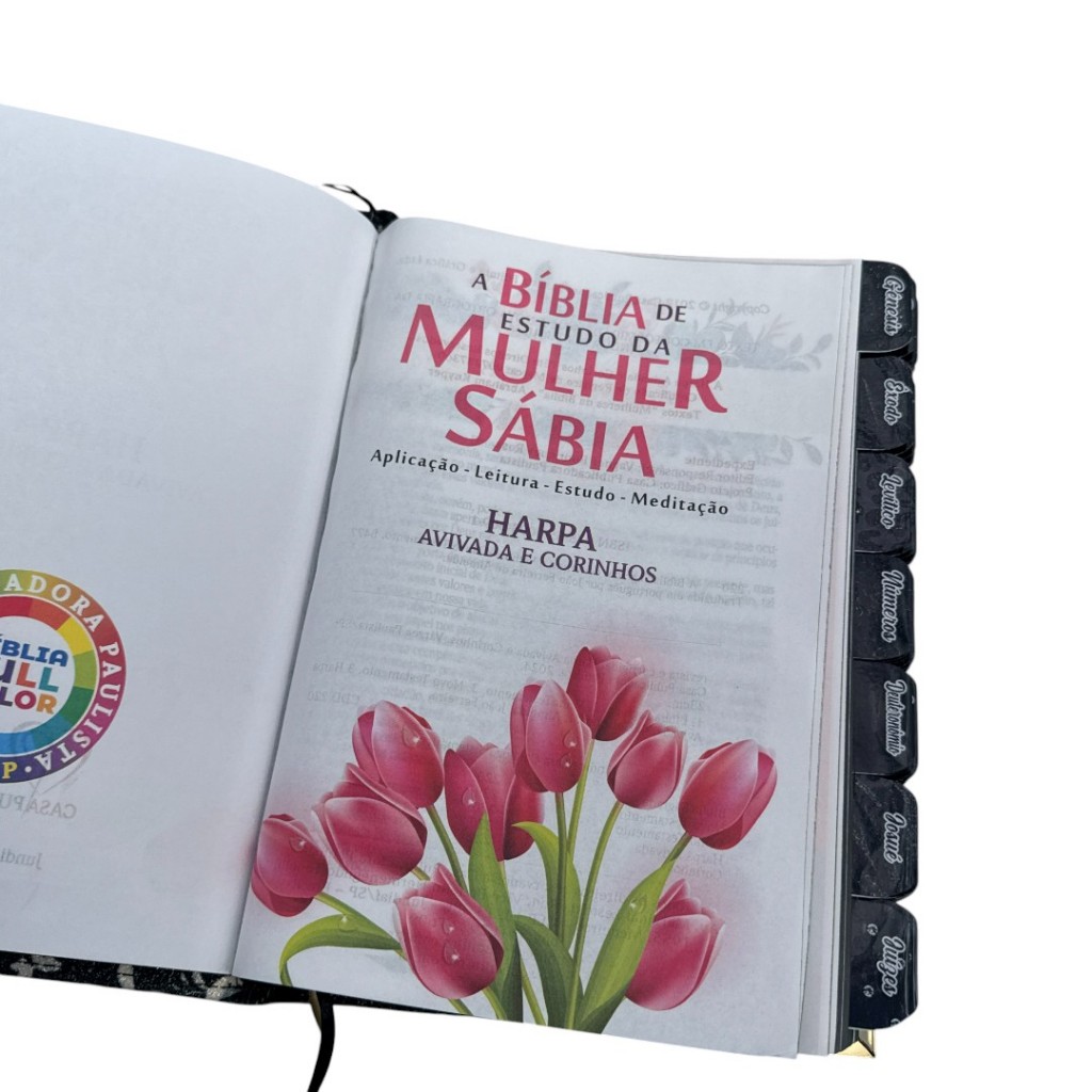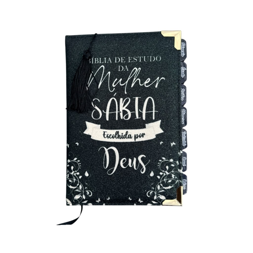 Bíblia de Estudos da Mulher Sabia Escolhida Arc Full Color Glitter 100% Preta Com Abas
