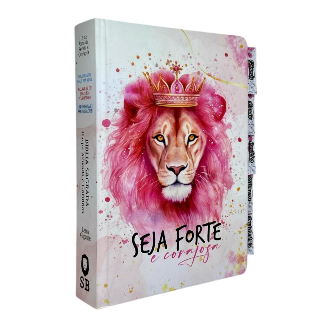 Bíblia Letra Gigante Linguagem Arc Leão Seja Forte Rosa Capa Dura Com Abas Adesivas e Harpa