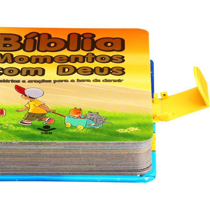 A Bíblia Momentos com Deus é um livro devocional que ajudará a criança a ficar ainda mais pertinho de Deus. Foi Idealizada para estimular a criança a passar um tempo com Deus, adquirindo o hábito de ler e orar. Para isso, reúne uma seleção de 31 histórias bíblicas, 14 do Antigo Testamento e 17 do Novo Testamento, sendo que ao final de cada uma há uma oração. As narrativas têm texto bíblico recontado de maneira clara e sensível, além de lindas ilustrações. Outro diferencial da obra é o seu acabamento. Com capa dura almofadada, fecho e alça, é perfeita para a criança levar a sua própria Bíblia para todos os lugares.