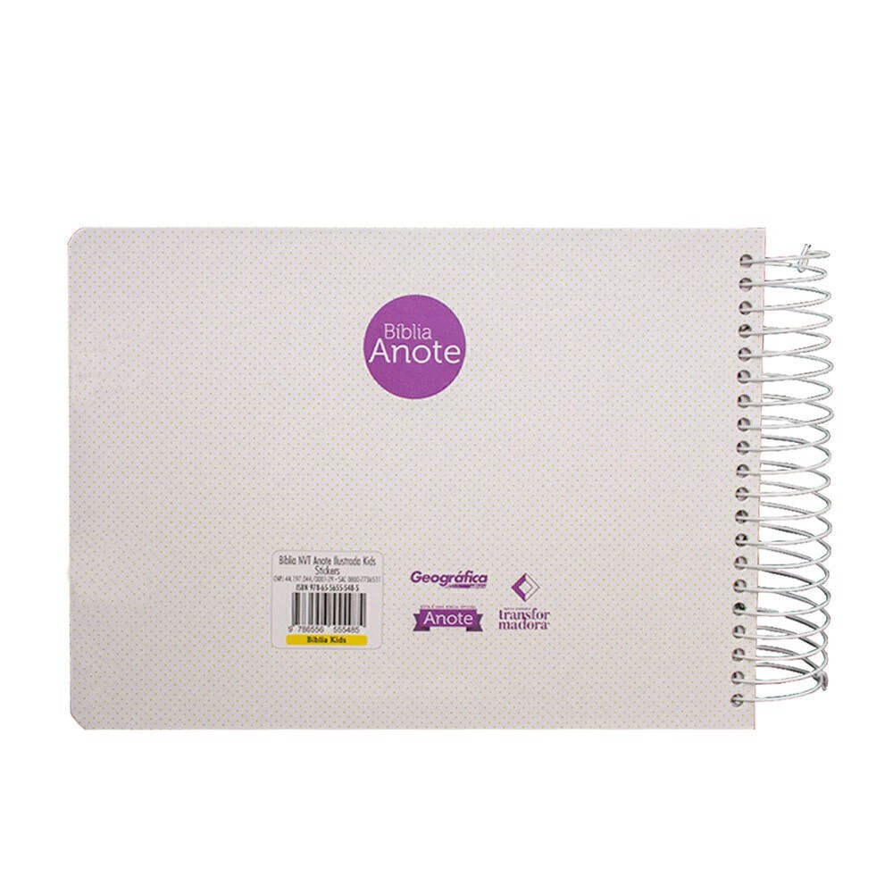 A Palavra de Deus com cor, criatividade e imaginação infantil. A Bíblia Ilustrada Anote Kids chegou para transformar o tempo devocional das crianças em uma experiência viva, divertida e inesquecível. Com formato horizontal e encadernação em espiral, ela é prática, resistente e feita para ser usada com liberdade. O texto bíblico completo na versão NVT (Nova Versão Transformadora) garante clareza e compreensão em linguagem acessível, ajudando os pequenos a mergulharem na Palavra de Deus com mais facilidade. O grande diferencial está no coração desta Bíblia: os espaços para anotações ficam no centro das páginas, um recurso único no mercado, que dá à criança a sensação de coautora de sua própria Bíblia, podendo escrever suas orações, anotações, insights e até desenhar o que sentiu durante a leitura. Modelo: Stickers ISBN: 9786556555485 Código do produto: 00126964 Autor: NVT Páginas: 1024 Formato: A17 x L24 x P3cm Acabamento: Capa Dura, pintura lateral, espiral, folha mais grossa Peso: 1090g
