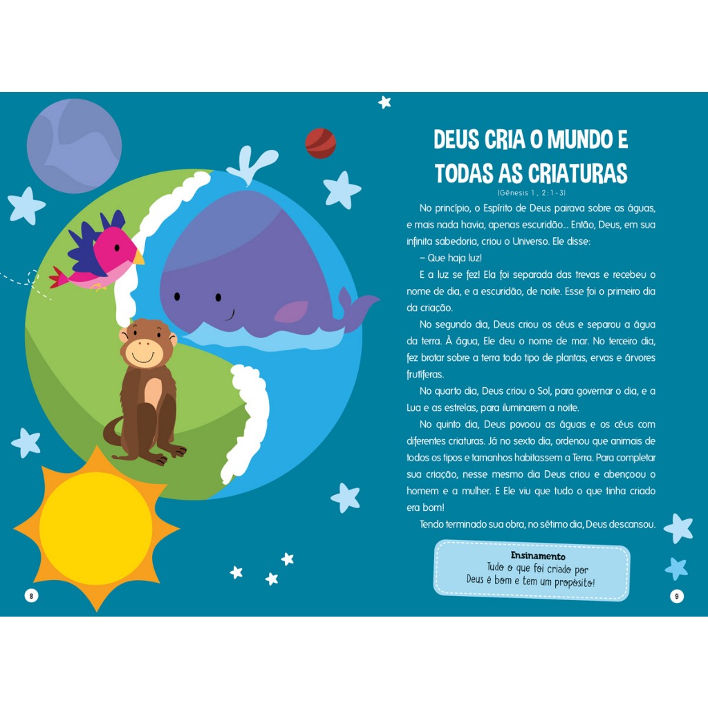 Encante-se com as mais belas histórias da Bíblia, como 'Deus cria o mundo e todas as criaturas', 'A arca de Noé e a tempestade', 'O nascimento do Menino Jesus' e muitas outras, que levam você a se aproximar de Deus, o grande Criador do Universo! Além das histórias, há lindos ensinamentos, para você refletir sobre cada um deles.