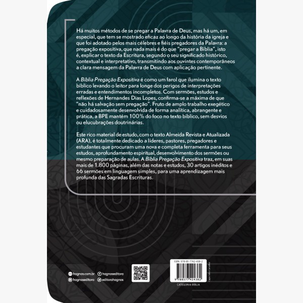 Bíblia Pregação Expositiva - RA - CAPA DURA - Modelo Redenção EDIÇÃO LIMITADA - MOLESKINE + CANETA Há muitos métodos de se pregar a Palavra de Deus, mas há um, em especial, que tem se mostrado eficaz ao longo da história da igreja e que foi adotado pelos mais célebres e fiéis pregadores da Palavra: a pregação expositiva, que nada mais é do que “pregar a Bíblia”, isto é, explicar o texto da Escritura, segundo o seu significado histórico, contextual e interpretativo, transmitindo aos ouvintes contemporâneos a clara mensagem da Palavra de Deus com aplicação pertinente. A Bíblia Pregação Expositiva é como um farol que ilumina o texto bíblico levando o leitor para longe dos perigos de interpretações erradas e entendimentos incompletos.Com sermões, estudos e notas de Hernandes Dias Lopes, confirma a máxima que “não há salvação, sem pregação”. Fruto de amplo trabalho exegético e cuidadosamente desenvolvida de forma analítica, abrangente e prática, a BPE mantém o 100% do foco no texto bíblico, sem desvios ou elucubrações doutrinárias. Este rico material de estudo vivo, com texto Almeida Revista e Atualizado (ARA), é totalmente dedicado a líderes, pastores, pregadores e estudantes que procuram uma nova e completa ferramenta para seus estudos, aprofundamento espiritual, desenvolvimento dos sermões ou mesmo preparação de aulas. A Bíblia Pregação Expositiva traz, em suas mais de 1800 páginas, além das notas e estudos, 30 artigos inéditos e 66 sermões em linguagem simples, para uma aprendizagem mais profunda das Sagradas Escrituras. DIFERENCIAIS: 1. As credenciais do autor. Hernandes Dias Lopes é doutor em Ministério Reformed Theological Seminary de Jackson, Mississippi – EUA, autor best-seller, com mais de 150 títulos publicados e diretor executivo da Instituição Luz para o Caminho. Conferencista nacional e internacional, tem 40 anos dedicados à pregação, não apenas em igrejas, mas em cruzadas evangelísticas. Seu vasto repertório, sua larga experiência e sua reconhecida habilidade retórica fazem dessa Bíblia uma obra singular e altamente relevante. 2. Ênfase na pregação expositiva. Em tempos em que a Igreja brasileira se vê seduzida a se afastar de um púlpito pujante e poderoso, substituindo-o por um púlpito açucarado e raquítico, é um alento ter em mãos uma Bíblia escrita por um fiel expositor da Palavra, que já comentou praticamente toda a Bíblia em seus Comentários Expositivos – Série teológicapublicada pela Hagnos. Sua notória autoridade nesta área referenda o potencial e a magnitude dessa Bíblia e seu valor inestimável para os que amam ministrar a Palavra expositivamente. 3. Variedade temática. Os assuntos abordados ao longo da Bíblia são bastante variados e atendem a diversas necessidades da igreja e do povo de Deus individualmente, como evangelismo, conversão, família, casamento, sexo, pecado, santificação, fé, perseverança, valores, espiritualidade, felicidade, enfrentamento de problemas, ansiedade, depressão, oração, além de temas teológicos relevantes, como a segunda vinda de Cristo, a ressurreição, a apostasia, escatologia individual e coletiva, entre tantos outros temas caros à igreja de Cristo. 4. Praticidade. Não basta ter inegável saber; é preciso ser um comunicador claro, objetivo e prático, e o pastor Hernandes Dias Lopes agrega essas qualidades em seus textos e sermões. Ele consegue transmitir o conteúdo das Escrituras de tal forma que qualquer pessoa possa compreender e captar o sentido da Palavra de Deus e aplicá-lo aos dias atuais. Um exímio expositor da Bíblia precisa alinhar conhecimento profundo com simplicidade, facilidade e funcionalidade, tudo de que precisamos e tudo de que essa Bíblia dispõe. Não será preciso ser formado em oratória ou teologia para usar os recursos homiléticos desta Bíblia com maestria. Seus textos atendem de forma equitativa tanto aos pregadores experientes quantos aos pregadores leigos, que certamente usufruirão de toda a praticidade e funcionalidade dos recursos valiosos desta Bíblia. 5. Projeto gráfico facilitador. Não menos importante é a disposição gráfica do material didático ao longo da Bíblia. Tudo foi pensado de forma a tornar a experiência do pregador a mais proveitosa possível. Cada estudo, sermão ou esboço está disposto de tal maneira que não prejudica o fluxo da leitura do texto bíblico. Esses estudos, sermões e esboços ocupam ou uma página inteira ou apenas meia página, e não quebram o texto bíblico de modo a dificultar o manuseio do material didático a ser ministrado. Esse projeto gráfico diferencial certamente se revela bastante benéfico e produtivo para o expositor da Bíblia. 1888 Páginas 16x23cm