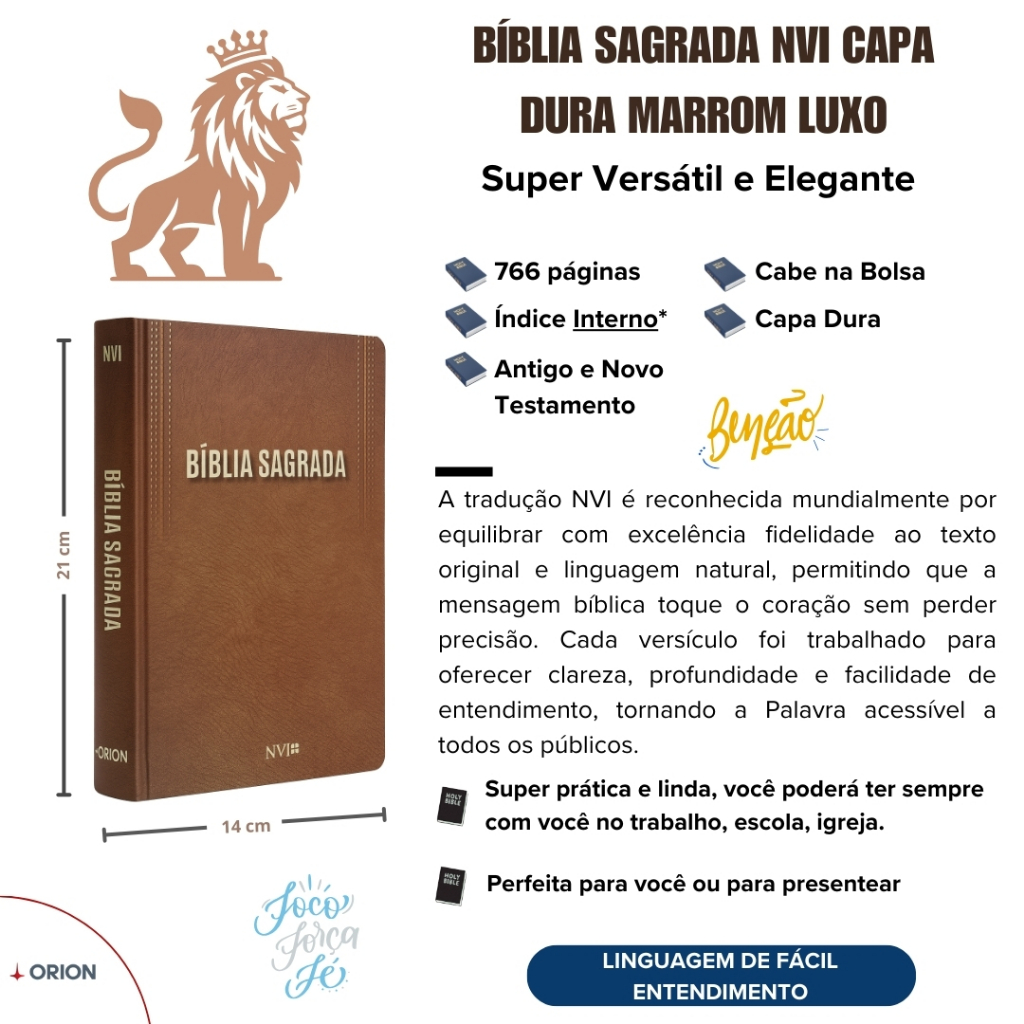 A Bíblia Sagrada NVI – Força e Coragem foi criada para quem busca uma edição resistente, bonita e acessível, sem abrir mão da excelência. Com capa dura de luxo, formato confortável (21,5 x 14 cm) e 766 páginas, esta edição combina durabilidade com uma leitura suave e clara. A consagrada tradução NVI oferece um texto fiel, moderno e de fácil entendimento, ideal para quem deseja aprofundar-se na Palavra com facilidade — seja no dia a dia, nos devocionais ou nos estudos. As palavras de Jesus aparecem com leve destaque, oferecendo orientação na leitura, porém sem alterar a sobriedade e o respeito ao texto. O miolo utiliza um papel especial de leitura, leve e confortável, proporcionando uma experiência agradável mesmo após longos períodos de uso. Para maior praticidade, esta edição conta com fitilho marcador e índice interno do Antigo e Novo Testamento, facilitando a navegação por livros e capítulos. É uma Bíblia perfeita para uso pessoal e um presente cristão inesquecível para amigos, familiares, discipuladores, líderes e novas conversões. Um gesto de fé que inspira, fortalece e acompanha por toda a vida. Tradução NVI: fiel, clara, atual e de fácil compreensão para leitura diária e estudos. Capa dura de luxo: resistente, elegante e ideal para quem busca durabilidade. Miolo com papel especial: leitura confortável sem reflexo, leve e ideal para longos momentos devocionais. 766 páginas completas: Antigo e Novo Testamento com excelente organização. Palavras de Jesus em leve destaque: orientação discreta para aprofundar o entendimento. Fitilho marcador: facilita a rotina devocional e estudos. Índice interno: navegação rápida entre AT e NT. Presente cristão perfeito: ideal para famílias, amigos, líderes e ocasiões especiais. Formato confortável: 21,5 x 14 cm, ótimo para levar à igreja, célula e estudos.