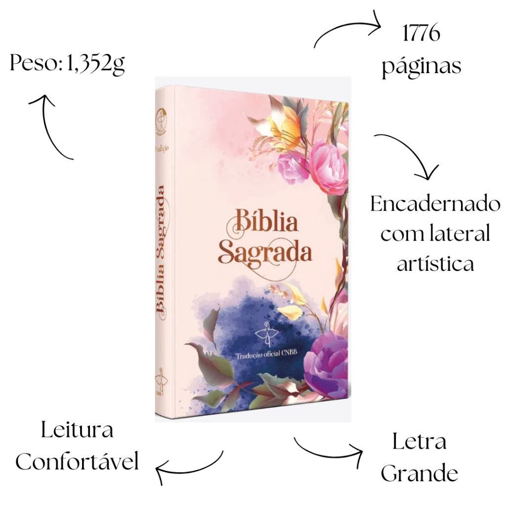 A Bíblia Sagrada com tradução oficial da CNBB, nesta edição de capa floral artística multicolorida, foi desenvolvida para unir conforto de leitura, beleza visual e profundidade espiritual. Com letra grande, esta edição proporciona leitura confortável e clara, ideal para leituras prolongadas, momentos de oração, estudos bíblicos e uso diário. A capa dura encadernada apresenta arte floral delicada e moderna, com lateral artística decorada, tornando esta Bíblia um verdadeiro objeto de devoção e também uma excelente opção de presente religioso. Conta com fitilho marcador de páginas, facilitando a organização da leitura, além de encadernação resistente e acabamento premium, pensados para uso contínuo ao longo dos anos. O conteúdo reúne o Antigo e o Novo Testamento completos, conforme a tradução oficial adotada pela Igreja Católica no Brasil. Leitura confortável de verdade: a letra grande reduz o esforço visual, ideal para quem lê com frequência. Visual artístico com alta durabilidade: apesar do acabamento delicado, a capa dura protege e preserva a Bíblia por muito mais tempo. Produto robusto: encadernação firme, indicada para uso diário e transporte frequente. Texto confiável: tradução oficial da CNBB, utilizada em missas, catequese e estudos bíblicos em todo o Brasil. Principais características: Tradução oficial da CNBB Letra grande para leitura confortável Capa dura encadernada com arte floral Lateral artística decorada Fitilho marcador de páginas Antigo e Novo Testamento completos Ideal para leitura diária, oração e estudo bíblico