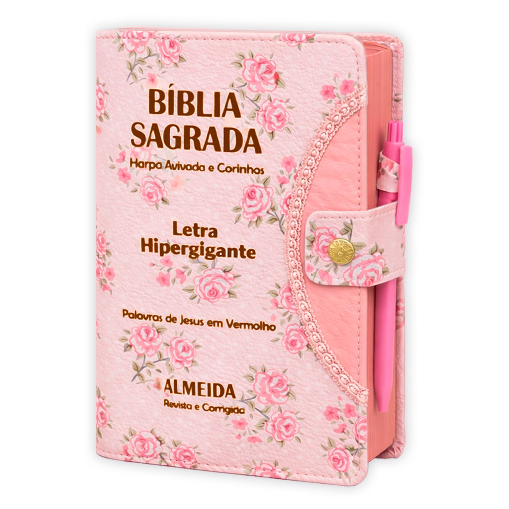 Bíblia Sagrada Hipergigante Rosa Floral com Botão e Harpa Cristã Completa
