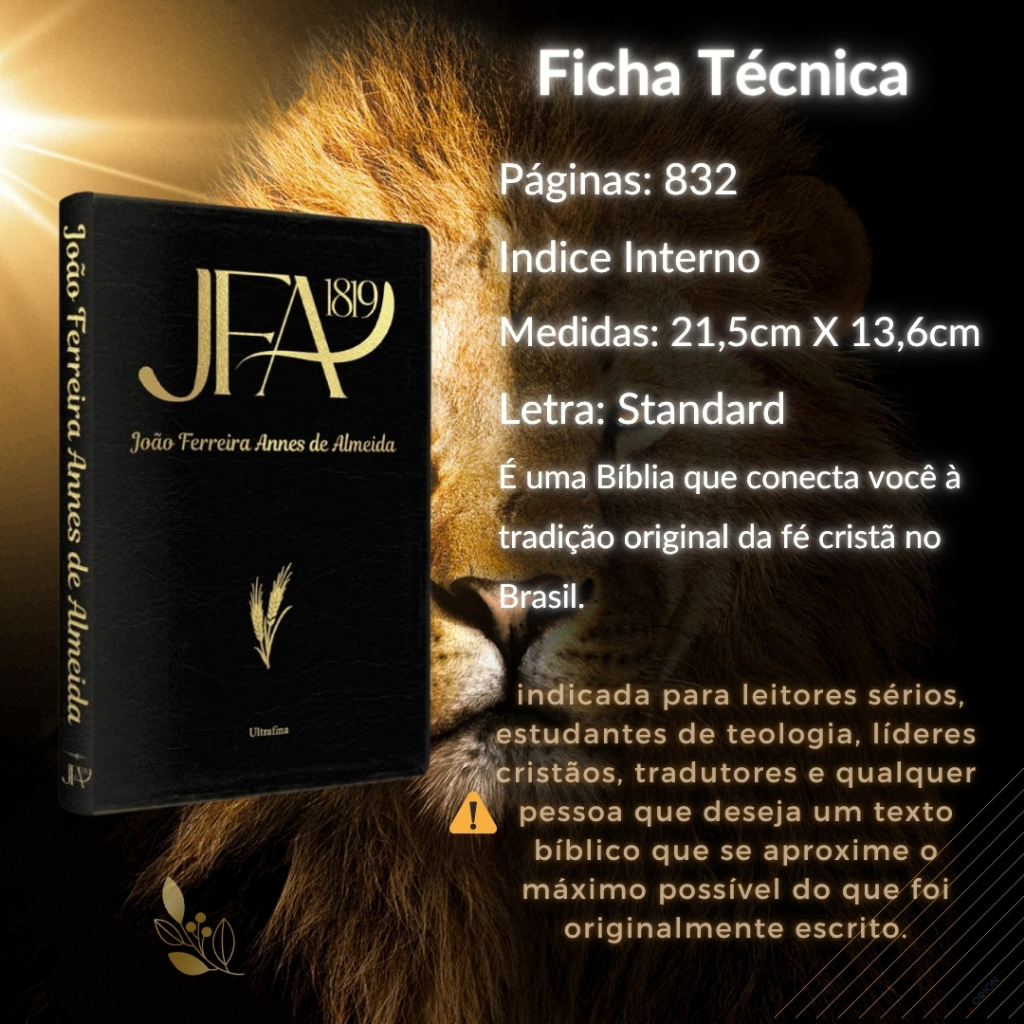 A Bíblia João Ferreira de Almeida 1819 Ultrafina Luxo é a combinação perfeita entre tradição, elegância e praticidade. Reconhecida por sua fidelidade rigorosa aos textos originais, a versão JFA 1819 preserva a essência da Palavra com profundidade, reverência e autoridade espiritual. É uma das traduções mais respeitadas do mundo cristão. Nesta edição ultrafina, você leva toda essa riqueza em um formato leve, prático e fácil de transportar — ideal para acompanhar você no dia a dia, no culto, no estudo ou em viagens. Com acabamento refinado, a Bíblia conta com capa luxo preta elegante e design sofisticado, tornando-se também uma excelente opção para presente. Uma Bíblia completa, com Antigo e Novo Testamento, feita para quem valoriza a Palavra e deseja tê-la sempre por perto. Tradução João Ferreira de Almeida 1819 Texto fiel e clássico altamente respeitado Edição ultrafina: leve e fácil de transportar Capa luxo preta elegante e resistente Ideal para uso diário, cultos e viagens Antigo e Novo Testamento completos Leitura fluida com linguagem clássica Perfeita para quem busca praticidade sem abrir mão da tradição DIFERENCIAIS DO PRODUTO • Versão JFA 1819: fidelidade máxima ao texto original • Formato ultrafino: cabe na bolsa, mochila ou mão • Design elegante e discreto • Ideal para uso constante no dia a dia • Une tradição + mobilidade Você não precisa escolher entre profundidade e praticidade — aqui você tem os dois. POR QUE COMPRAR ESSA BÍBLIA? Para ter uma Bíblia fiel e confiável Para levar com facilidade para qualquer lugar Para usar no culto sem peso ou volume Para presentear com elegância Para manter a Palavra sempre com você Essa é a Bíblia ideal para quem quer carregar a Palavra todos os dias, sem abrir mão da qualidade. Leve, elegante e extremamente fiel. Garanta agora a sua e tenha a Bíblia sempre ao seu alcance. “A Palavra de Deus, agora com você em todos os lugares.”
