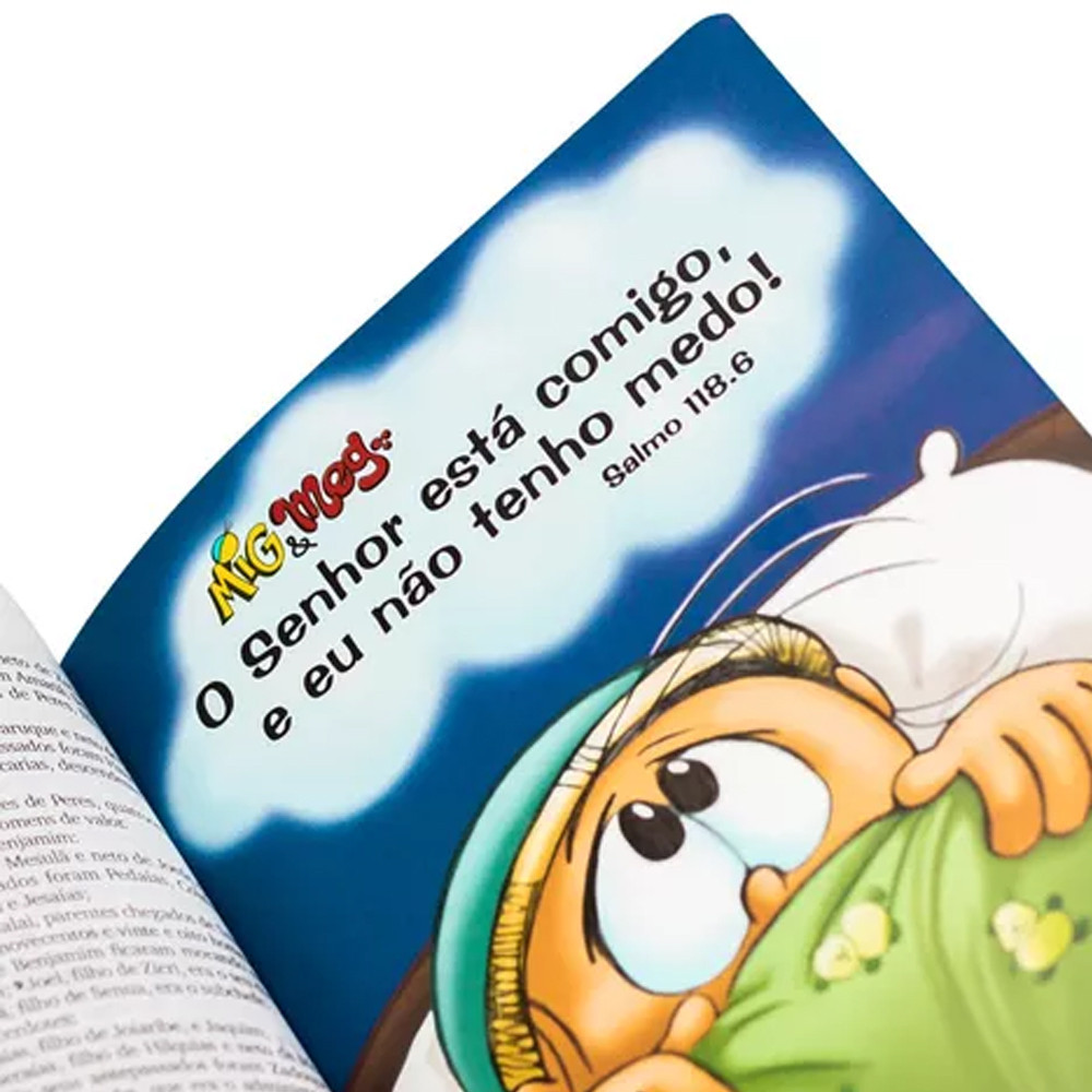 Esta é uma nova edição da Bíblia Sagrada com a turma Mig & Meg. Na Nova Tradução na Linguagem de Hoje, a publicação vem com duas opções de capa dura com canto arredondado. Traz também encarte inicial com dedicatória, auxílio Fonte de Bênçãos, um índice de passagens bíblicas que aborda quatro aspectos da vida cristã: relacionamento com Deus, relacionamento com as pessoas, relacionamento com a Palavra de Deus e bênçãos da vida cristã. Os versículos recebem destaque ao longo do texto bíblico. Contém 40 páginas coloridas com os personagens Mig & Meg e texto em destaque com referência bíblica. A edição vem, ainda, com uma cartela de adesivos, para a criança levar a mensagem de Deus sempre com ela.Recurso :- Como encontrar ajuda na Bíblia- Índice de passagens bíblicas Fonte de Bênçãos- Leituras para dias especiais- Mapas- Palavras de orientação e consolo- Plano de evangelização pessoal- Versículos destacados- VocabulárioRecursos Adicionais :- 40 páginas coloridas com os personagens Mig & Meg e texto em destaque com referência bíblica;- Cartela de adesivos;Detalhes do Produto:Tradução: Nova Tradução na Linguagem de HojeIdioma: PortuguêsTamanho da Letra: MaiorCapa: IlustradaAcabamento: Capa duraMedida: 11,5 X 16,5 cmFormato: PequenoPáginas: 1.312 páginasÍndice: NãoIndicado para: Crianças