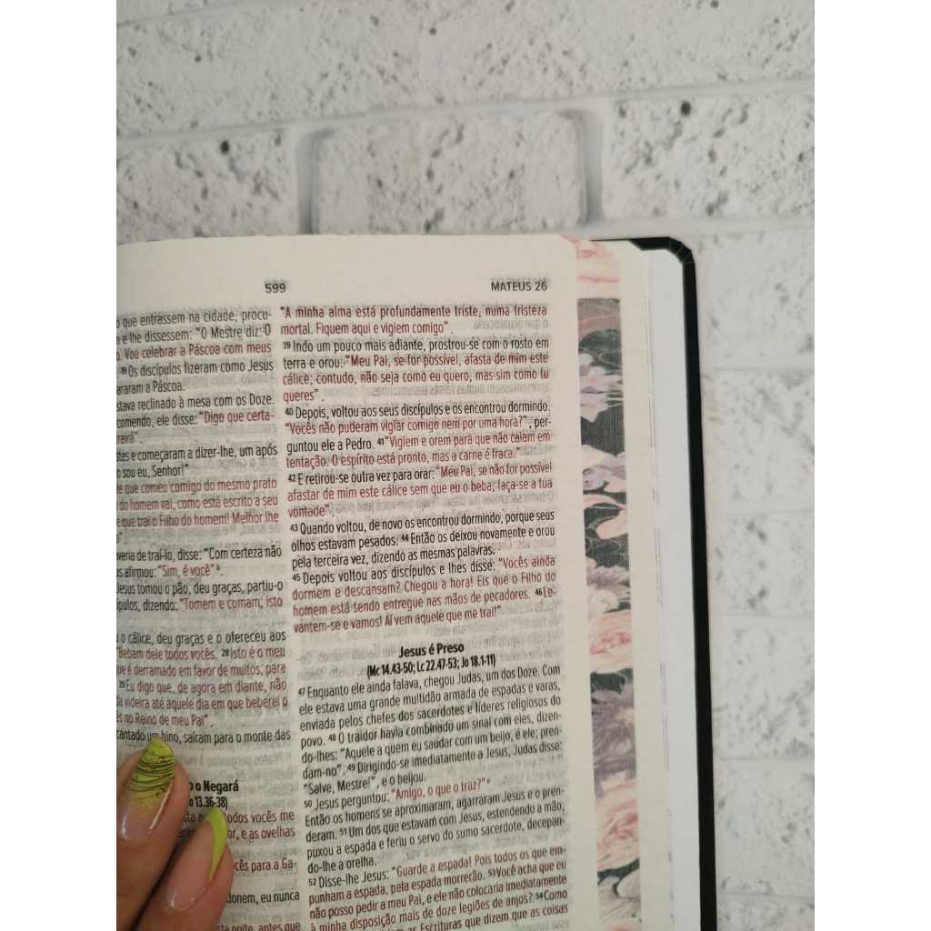 Capa dura em material Soft touch.Bordas Arredondadas em corNova Versão Internacional (NVI)Panorama bíblico em quadrosPalavras de Jesus em vermelho Tamanho 14x21cm Capa dura