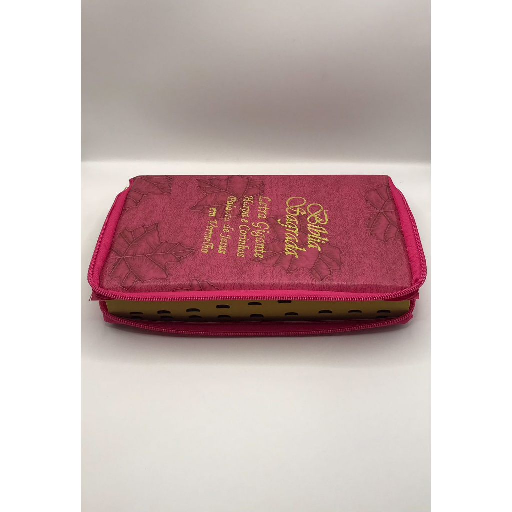 Bíblia Sagrada Tamanho Grande com Harpa Palavras de Jesus em Vermelho Zíper Capa Folha Pink