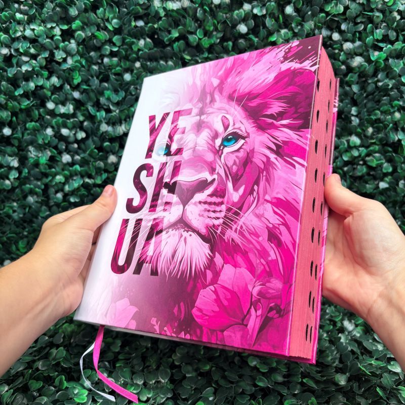 Bíblia Sagrada ULTRA GIGANTE Evangélica Leão Capa Dura com Harpa, Índice, LETRA JUMBO, FOLHA ECOLÓGICA (há foto REAL das letras no anúncio), palavras de Jesus destacadas e lateral rosa, um detalhe único que torna essa Bíblia perfeita para levar a igreja, cultos de jovens ou presentear. - Capa Dura - Versão Almeida Revista e Corrigida (ARC), uma tradução confiável e respeitada - Letra JUMBO, Folha ECOLÓGICA - Palavras de Jesus em destaque - Índice nas laterais para facilitar sua busca por versículos - Harpa e Corinhos, desfrute de uma seleção de hinos que elevarão sua adoração - Sessão de Promessas - Antigo e Novo Testamento - Dois marca páginas de fitilho, possibilitando marcar uma passagem bíblica e um cântico da harpa - Envio Imediato Ótima opção para presentear quem você ama! Entrega rápida e segura para todo Brasil. Medidas: Altura 24 x Largura 18,5 x Comprimento 5