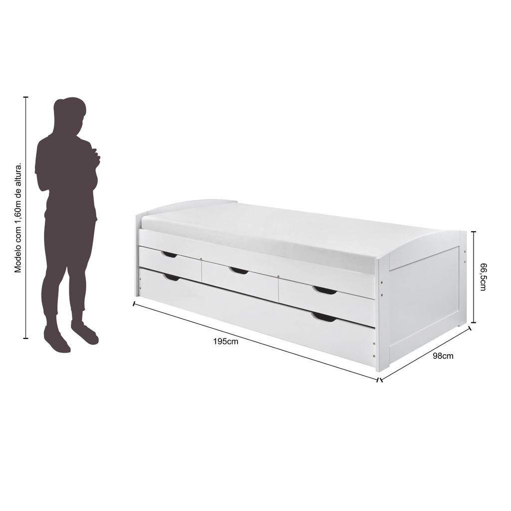Esse modelo denominado, foi projetado pensando nas famílias que precisam ter duas camas, mais espaço para guardar objetos ou roupa, uma vez que esse modelo tem três gavetas e mais a cama extra na parte inferior. Sendo assim aqui você encontra em um só móvel espaço para armazenar os seus pertences e mais duas camas de solteiro. Estilo: Moderno Peso (kg): 50.7 Garantia: 03 Meses Altura (cm): 66.5 Acabamento: Pintura UV Extensível: Não Largura (cm): 98 Possui Baú: Não Possui Pés: Não Possui Grade: Não Tipo de Cama: Convencional Possui Nichos: Não Possui Portas: Não Comprimento (cm): 195 Possui Gavetas: Sim Possui Rodízio: Sim Suporta Até (kg): 120 Possui Espelhos: Não Profundidade (cm): 98 Tamanho da Cama: Solteiro Tipo de Estrado: Removível Escala de Brilho: Fosco Gaveta com Chave: Não Serviço Montagem: 114259443 Acompanha Colchão: Não Origem do Produto: Nacional Rodízio com Trava: Não Ambiente Principal: Quarto Material da Gaveta: Madeira Maciça Material Principal: Madeira Maciça Possui Prateleiras: Não Possui Escrivaninha: Não Acabamento da Gaveta: Pintura Peso Máximo por Gaveta: 15 Tipo de Madeira Maciça: Pinus Acompanha Cama Auxiliar: Sim Cama Auxiliar com Rodízio: Sim Possui Trava de Segurança: Não Tipo de Puxador da Gaveta: Embutido Escala de Brilho da Gaveta: Fosco Tipo de Corrediça da Gaveta: Madeira Altura do Estrado até o Chão: 33 Cama Auxiliar Suporta Até (kg): 120 Peso Suportado por cada Cama: 120 Cama Auxiliar Acompanha Colchão: Não Tipo de Madeira Maciça da Gaveta: Pinus Permite a Utilização de Cama Auxiliar: Sim Marca: FAMACHIQ Cor do Produto: Branco Itens Inclusos: Dois volumes sendo um da cabeceira e estrado, a outra com as barras e demais componentes Cor Predominante: Branco Quantidade de Gavetas: 03 Gavetas Tamanho do Colchão Indicado (L x C): 190X90cm Tamanho do Colchão Indicado Cama Auxiliar (L x C): 90x190cm
