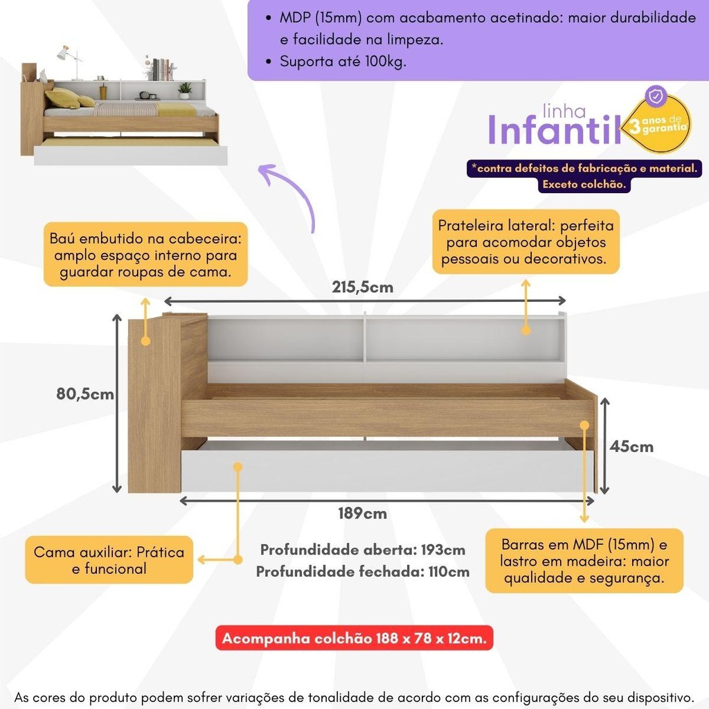 A Bicama de Solteiro com Colchão Incluso Baú Embutido e Prateleira Multimóveis MP4259 é produzida em MDP (15mm) com acabamento acetinado (cerca de 20% de brilho), garantindo durabilidade e resistência. Para oferecer qualidade e segurança, possui barras em MDF e lastro em madeira, suportando até 100kg na cama principal. O baú embutido na cabeceira pode ser montado em ambos os lados e possui amplo espaço interno para guardar roupas de cama, otimizando o espaço do ambiente. Além disso, as prateleiras laterais acomodam objetos pessoais e decorativos. A cama auxiliar suporta até 60kg e possui rodízios, proporcionando praticidade na sua movimentação e na limpeza do ambiente. Acompanha colchões (D23) em espuma 100% poliuretano com tecido 100% poliéster, conforto macio, tratamento antiácaro, antialérgico e antimofo, indicados para até 70kg. Esta bicama é um produto essencial para compor quartos de solteiro com elegância e funcionalidade. Conteúdo da Embalagem: 1 (uma) Bicama com Baú e Prateleira Lateral 2 (dois) Colchões Manual de Montagem Kit Ferragem Dimensões do produto montado: Bicama - Altura: 80,5cm | Largura: 215,5cm | Profundidade: 110,5cm (fechada) - 193,5cm (aberta) Colchões - Altura: 12cm | Largura: 188cm | Profundidade: 78cm *Você pode consultar as medidas detalhadas na imagem técnica do produto. *As cores do produto podem sofrer variações de tonalidade de acordo com as configurações do seu dispositivo. Imagem meramente ilustrativa. Decoração não acompanha o produto. O produto será entregue desmontado e não disponibilizamos o serviço de montagem.