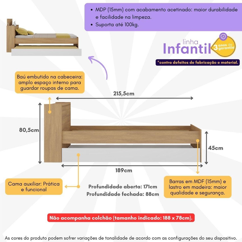 A Bicama de Solteiro para Colchão 188 x 78cm com Baú Embutido Multimóveis MP4258 é produzida em MDP (15mm) com acabamento acetinado (cerca de 20% de brilho), garantindo durabilidade e resistência. Para oferecer qualidade e segurança, possui barras em MDF e lastro em madeira, suportando até 100kg na cama principal. O baú embutido na cabeceira pode ser montado em ambos os lados e possui amplo espaço interno para guardar roupas de cama, otimizando o espaço do ambiente. Além disso, a cama auxiliar suporta até 60kg e possui rodízios, proporcionando praticidade na sua movimentação e na limpeza do ambiente. NÃO acompanha colchão (tamanho indicado do colchão: 188 x 78 cm). Esta bicama é um produto essencial para compor quartos de solteiro com elegância e funcionalidade. Conteúdo da Embalagem: 1 (uma) Bicama com Baú Manual de Montagem Kit Ferragem Dimensões do produto montado: Altura: 80,5cm | Largura: 215,5cm | Profundidade: 88cm (fechada) - 171cm (aberta) *Você pode consultar as medidas detalhadas na imagem técnica do produto. *As cores do produto podem sofrer variações de tonalidade de acordo com as configurações do seu dispositivo. Imagem meramente ilustrativa. Decoração não acompanha o produto. O produto será entregue desmontado e não disponibilizamos o serviço de montagem.