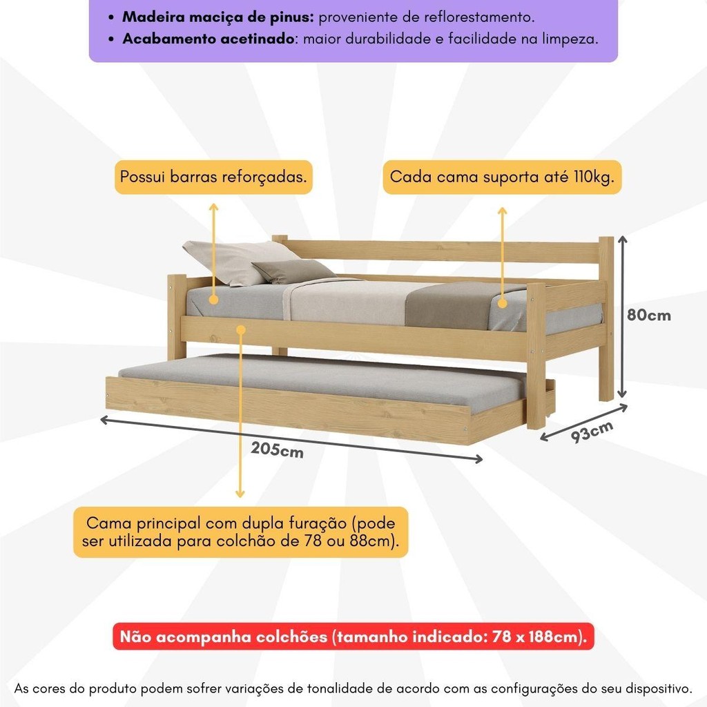 A Bicama Madeira Maciça para Colchão 78/88 x 188cm Paris Multimóveis é produzida 100% em madeira maciça proveniente de reflorestamento. Com dupla furação na cama principal, possui barras reforçadas e suporta até 110kg em cada cama. Super versátil, pode ser utilizada tanto no quarto como na sala, criando um ambiente moderno e descontraído. Não acompanha colchões (tamanho indicado - Cama principal: 78/88 x 188cm | Cama auxiliar: 78 x 188cm). ”A cama auxiliar possui rodízios que facilitam sua movimentação.” Conteúdo da Embalagem: 1 (uma) Bicama Manual de Montagem Kit Ferragem Dimensões do produto montado: Altura: 80cm | Largura: 205cm | Profundidade: 93cm *Você pode consultar as medidas internas na imagem técnica do produto. *As cores do produto podem sofrer variações de tonalidade de acordo com as configurações do seu dispositivo. Imagem meramente ilustrativa. Decoração não acompanha o produto. O produto será entregue desmontado e não disponibilizamos o serviço de montagem.