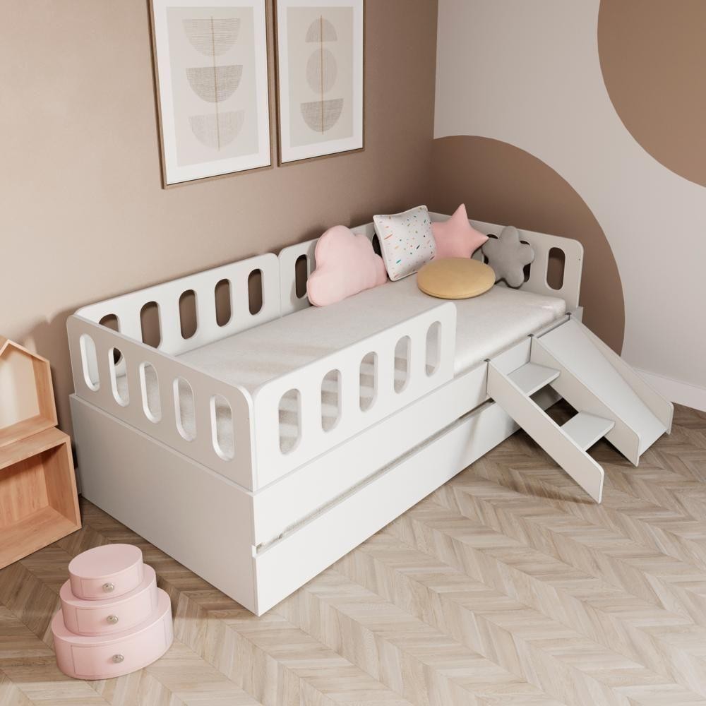 Bicama Solteiro Mdf Branco Com Escadinha/escorrega 03 Grades E Cabeceira Anatômica Mobilistore DETALHES DO PRODUTO Material: MDF Melamina de Alta Qualidade Pintura/Acabamento: Branco Liso Medida do Colchão da Cama (cm x cm): 188x88 (Não incluso) Medida do Colchão da Cama Auxiliar (cm x cm): 188x88 *14 (Altura Máxima Recomendada) (Não incluso) Peso Suportado Cama :120 Kg Peso Suportado Cama Auxiliar :120 Kg Diferenciais: Auxiliar com 4 rodízios, MDF Melamina 15mm, Estrados em Madeira Maciça, Escadinha/Escorrega, 03 Grades e Cabeceira e Peseira Anatômica. DIMENSÕES CAMA Largura (cm):195,5 Altura (cm):70 Profundidade (cm):93 INFORMAÇÕES COMPLEMENTARES Necessita de Montagem:SIM (Acompanha Manual de montagem) Atenção:Não realizamos serviço de montagem e instalação. Imagens meramente ilustrativas. Cores e tonalidades podem variar. Garantia do Fabricante:Prazo de 3 meses por defeito de fabricação EMBALAGEM Peso (Kg):79,1 Quantidade de Volumes:05 Material Principal: MDF | Cor Predominante: Branco | Necessita Montagem: Sim | Acompanha Colchão: Não | Tipo de Cama: Bicama | Cor: Branco