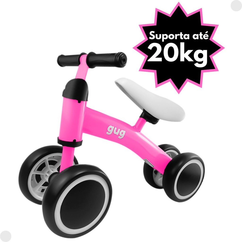 DESCRIÇÃO DO PRODUTO: A bicicleta rosa de 4 rodas, estimula o equilíbrio e a coordenação motora do pequeno na fase de desenvolvimento, de forma divertida e segura. A criança aprende desde cedo a se equilibrar e adquirir autoconfiança, facilitando a transição para a bicicleta com pedais. Mantendo os pés em contato com o chão, a criança sempre terá o controle da velocidade e movimento. É estável, pois possui rodas duplas na frente e atrás, com design diferenciado. Suporta até 20kg. Fácil de montar vem as instruções na caixa. Indicado para crianças acima de 12 meses. Habilidades Desenvolvidas: • Coordenação Motora. • Autoconfiança e Segurança. • Autonomia. • Equilíbrio Estático e Dinâmico. • Percepção Espacial. CARACTERÍSTICAS TÉCNICAS: Conteúdo da Embalagem: 01 Mini Bike Rosa. Dimensões Aproximadas do Produto: 44cm x 47cm x 20cm (Altura x Largura x Comprimento/Profundidade) Dimensões Aproximadas da Embalagem: 19cm x 16cm x 50cm (Altura x Largura x Comprimento/Profundidade) Material/Composição: Plástico (PP), revestimento de tinta e EVA. Idade Mínima Recomendada: A partir de 12 Meses. Referência: 1039 Outras informações: As cores podem variar entre as imagens mostradas acima e o produto. Imagens meramente ilustrativas. Aviso: As informações e imagens divulgadas são de total responsabilidade do fabricante/fornecedor. Produto lacrado e disponível a pronta entrega para todo Brasil! APROVADO PELO INMETRO