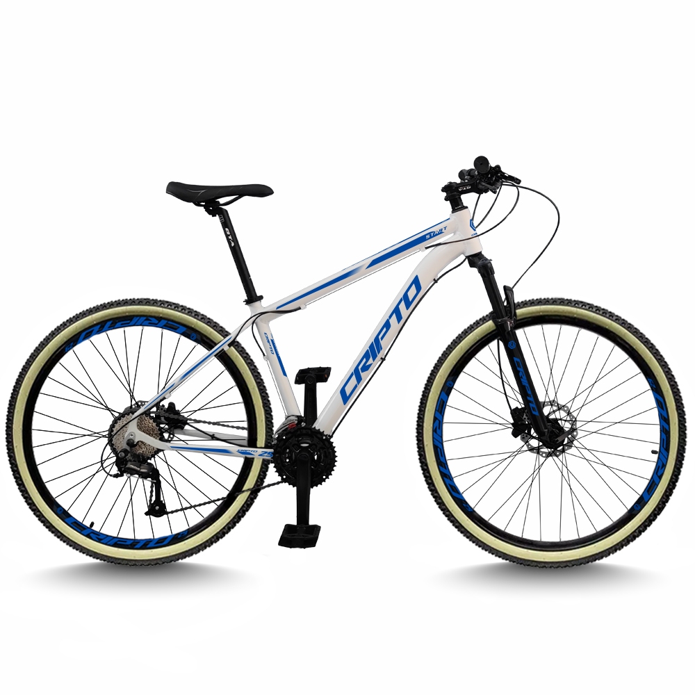 Bicicleta Aro 29 Cripto 24 Marchas Freios Disco e Suspensão Pneu Faixa Bege