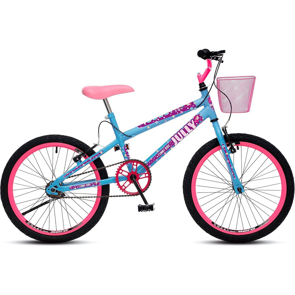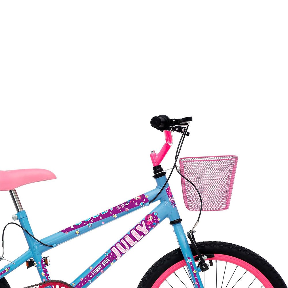 Bicicleta Colli Jully, Aro 20 aero 36 raias, Freios v-brake dianteiro e traseiro, Suporte de guidão down hill e cestinha. Informações Técnicas: Aro 20 aero dianteiro Coroa 40d Cesto aro 20 rosa Freio v brake nylon Garfo 20 colli pintado Manopla mirim Movimento direcao comum com colar Pedivela monobloco 140x15mm Quadro 20 colli pintado Selim toy pvc rosa c/ canote Aro 20 aero 36f traseiro s/ espacador montado Corrente grossa 1/2x1/8 Descanso lateral aro 20 Guidao downhill aco mirim com suporte soldado Macaneta de nylon 26 26movimento central 45mm com colar Pedal ½ Pneu 20x1.75 Roda livre 1v 18d Idade Recomendada: A Partir de 8 Anos Acessórios da Embalagem: 01 Quadro 01 garfo com roda traseira 01 roda dianteira 01 guidão. 01 Kit Selim, Canote, Pedais 01 Manual do proprietário. Dimensões: Altura: 82 cm Largura: 61 cm Profundidade: 130 cm Peso: 13,4 kg Garantia do Fabricante contra defeito de fábrica: 3 meses.