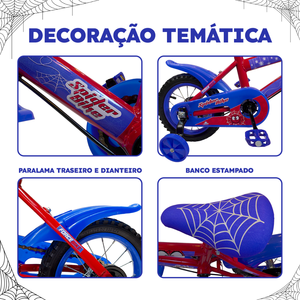 FORCE BIKE – Modelo Spider Estilo e segurança em um design moderno e resistente. Ideal para crianças de 2 a 7 anos, suporta até 50 kg e garante conforto, estabilidade e muita diversão em cada pedalada. O UNICO MODELO ARO 12 COM RODAS DE AÇO DO BRASIL: - Quadro em aço carbono de alta resistência - Rodas, aros e cubos em aço - Pneus de borracha inflável padrão automotivo - Freios V-Brake dianteiro e traseiro - Banco estofado com regulagem de altura e estampa de teias - Cestinha azul frontal funcional - Paralamas dianteiro e traseiro - Proteção de corrente - Pézinho de apoio nas cores do produto - Certificação Inmetro Dimensões 86 x 54 x 52 cm 🎨 Cores Azul e vermelho com decoração exclusiva Spider Bike ⚠️ Instruções de Segurança Utilizar sempre com supervisão de um adulto Verificar freios, pneus e fixações antes do uso Usar capacete, joelheiras e cotoveleiras para maior proteção