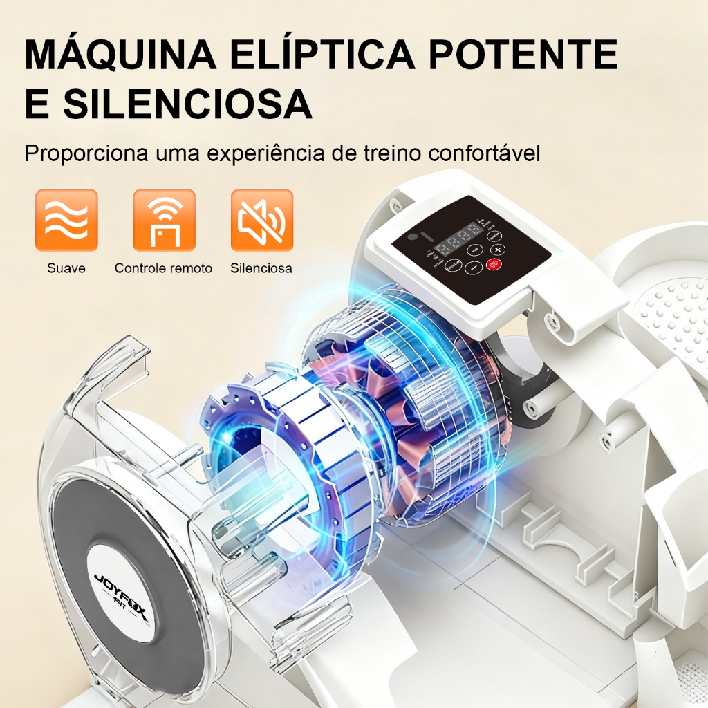 Por ser uma bicicleta elíptica compacta, com a Joyfox Fitness pode movimentar-se enquanto vê televisão no sofá, trabalha ou acede ao computador, enquanto está à mesa a preparar uma receita e até ao ar livre, pois tem alças de transporte ergonómicas. BAIXO IMPACTO E 0 PRESSÃO O exercício de baixa intensidade com a elíptica debaixo da secretária é especialmente adequado para idosos e pessoas que estão a fazer reabilitação das pernas. O exercício de baixa intensidade pode queimar calorias, melhorar a saúde cardiovascular e fortalecer os músculos, ao mesmo tempo que ajuda as pernas a adaptarem-se e recuperarem rapidamente. ECRÃ LCD E COMANDO À DISTÂNCIA O ecrã LCD regista a sua velocidade, distância, tempo, calorias e número de passos em tempo real, o que o ajuda a controlar o seu progresso físico. Com o comando à distância, pode ajustar facilmente os modos sem precisar de se baixar, o que reduz a tensão nas costas e o torna especialmente fácil de usar para pessoas idosas. (Nota: as pilhas para o comando remoto não estão incluídas e devem ser adquiridas separadamente). MODOS 2 EM 1 E AUTOMÁTICO OU MANUAL A máquina elíptica Joyfox para debaixo da secretária oferece modos manual (12 níveis de velocidade) e automático (P1-P3). Os pedais podem ser ajustados para se moverem para a frente ou para trás, proporcionando um treino versátil que se concentra em diferentes grupos musculares. Os idosos e as pessoas em reabilitação podem ajustar o ritmo para se adaptar à sua velocidade preferida, o que os ajuda a atingir os seus objetivos de fitness. 12 modos de velocidade Rotação silenciosa e suave para a frente e para trás Ecrã LCD digital Inclui comando remoto, cabo de alimentação e instruções de utilização Modo dois em um: modo automático ou manual Exercícios para pernas em casa Mover as pernas ajuda a estimular a circulação, manter os músculos ativos e os órgãos funcionando bem, sendo um exercício que deve ser diário e constante. O pacote inclui: Máquina elíptica x 1 Cabo de alimentação x 1 Controlo remoto x1 (pilha não incluída) Manual do utilizador x 1