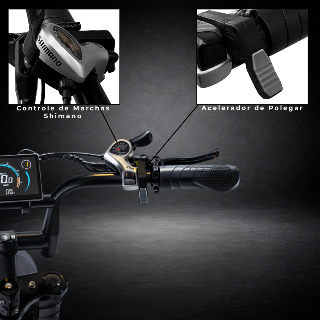 Autopropelido Prepare-se para elevar o nível da sua pilotagem. A V8 1000W entrega potência, estabilidade e desempenho em qualquer trajeto. Com motor forte, pneus FAT e estrutura reforçada, ela foi desenvolvida para quem busca liberdade, autonomia e controle tanto no asfalto quanto em terrenos mais exigentes. Robusta, imponente e equipada com componentes de alto padrão, a V8 1000W une tecnologia, segurança e performance em uma experiência completa sobre duas rodas. CONTEÚDO DA EMBALAGEM 1x Bicicleta Elétrica V8 1000W 1x Carregador 1x Bomba de ar portátil 1x Estojo de ferramentas com manual de montagem 1x Par de pedais INFORMAÇÕES TÉCNICAS Motor elétrico: 1000W Bateria de lítio removível: 48V / 15Ah Tempo de recarga: 4 a 6 horas Velocidade máxima: até 50 km/h Capacidade de carga: até 120 kg Peso líquido: 35 kg bicicleta elétrica V8, scooter elétrica 48V, bike elétrica urbana, mobilidade sustentável, bicicleta elétrica econômica. Quadro em aço cromo molibdênio Pneus FAT Aro 20 x 4.0 Pressão dos pneus: 20 PSI / 140 KPA Suspensão dianteira Freios a disco com sistema EBS Freio hidráulico Câmbio de 7 marchas PAS (Pedal Assistido) Acelerador na manopla Painel digital Farol em LED Buzina Lanterna traseira com setas (piscas) Pedais em liga de alumínio Carregador bivolt: 110V / 220V Cor: Preto Modelo: V8 1000W GARANTIA A V8 1000W possui 3 meses de garantia, conforme previsto em lei, cobrindo exclusivamente defeitos de fabricação. A garantia não cobre: Danos causados por mau uso Montagem incorreta ou instalação inadequada Desgaste natural de peças Danos decorrentes de quedas, impactos ou acidentes Alterações ou modificações no produto Uso em desacordo com as orientações do manual Para que a garantia seja válida, é fundamental seguir corretamente as instruções de montagem, uso e manutenção descritas no manual.