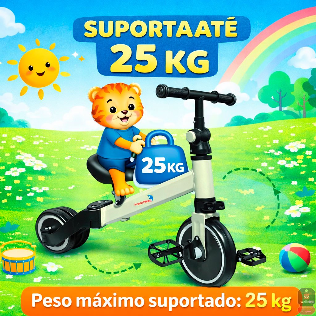 Bicicleta de Equilíbrio Infantil 3 em 1 Importway – Diversão, Aprendizado e Segurança A Bicicleta de Equilíbrio Infantil 3 em 1 Importway é ideal para estimular o desenvolvimento motor, equilíbrio e coordenação da criança de forma segura e divertida. Com design inteligente e versátil, permite três modos de uso: bicicleta de equilíbrio, triciclo e mini bicicleta, acompanhando o crescimento dos pequenos. Fabricada com materiais resistentes e de alta qualidade, oferece estabilidade, conforto e durabilidade para passeios no parque, quintal ou áreas internas. Seu visual moderno e colorido torna a experiência ainda mais atrativa para a criança. Principais Benefícios • Produto 3 em 1: balance bike, triciclo e mini bicicleta • Auxilia no desenvolvimento do equilíbrio e coordenação motora • Estrutura resistente em aço de alto carbono • Rodas em EVA: silenciosas, macias e duráveis • Leve, segura e fácil de manusear • Ideal para uso interno e externo • Produto certificado Especificações Técnicas • Marca: Importway • Modelo: BW312 • Material: Aço de alto carbono, PVC, PP e rodas em EVA • Modos de uso: Balance Bike / Triciclo / Mini Bicicleta • Dimensões no modo balance bike: 69 x 43 x 47 cm • Dimensões no modo triciclo: 64 x 15 x 47 cm • Peso máximo suportado: 25 kg Itens Inclusos • 01 Bicicleta de Equilíbrio Infantil Importway 3 em 1