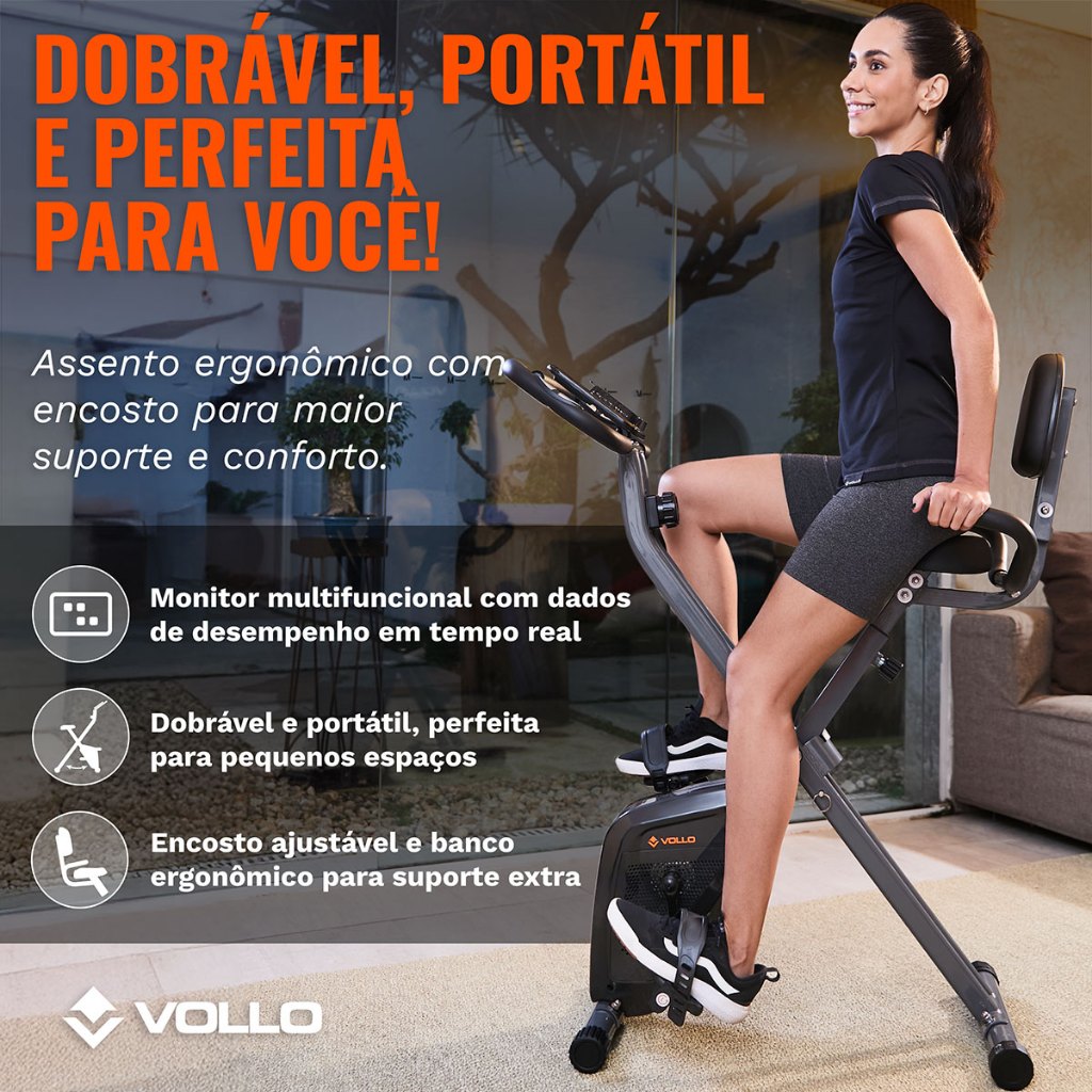 Bicicleta Ergométrica Vertical Dobrável X-Bike com Encosto Vollo Magnética Mantenha sua rotina de treinos em dia com conforto e eficiência com a Bicicleta Ergométrica Dobrável X-Bike com Encosto da Vollo. Compacta e silenciosa, ela é ideal para quem busca um equipamento funcional e que se adapte facilmente a ambientes menores. Seu design vertical dobrável e portáril permite fácil armazenamento, enquanto o banco com encosto e ajuste de altura proporciona maior apoio à coluna, reduzindo impactos nas articulações e promovendo treinos mais seguros e estáveis. Com estrutura robusta e leve, a bicicleta X-Bike oferece monitor multifuncional com leitura de tempo, velocidade, distância, calorias e frequência cardíaca. A resistência magnética garante treinos suaves e silenciosos, perfeitos para qualquer hora do dia. Além disso, os pedais antiderrapantes e o suporte para smartphone tornam a experiência mais personalizada e confortável, ajudando você a alcançar seus objetivos com muito mais praticidade. Principais Benefícios Bicicleta Ergométrica Magnética Dobrável Vollo • Monitor multifuncional: Tempo, Velocidade, Distância, Calorias e Frequência Cardíaca • Display: LCD • Porta Objetos: Suporte para smartphone • Guidão: Revestido em borracha macia e antiderrapante com sensor de batimentos • Sistema de resistência: Magnética • Níveis de Resistência (Carga): 08 Níveis de tensão • Regulador de esforço: Sim • Sistema de transmissão: Suave e silenciosa • Banco: Selim com encosto confortável e ajustável Altura (vertical) • Pedais: Duplos antiderrapantes com presilhas para os pés • Incluso: Kit de montagem e manual em português Especificações Bicicleta Ergométrica Magnética Dobrável Vollo • Indicação: Residencial • Peso máximo do usuário: 100 Kg • Altura máxima do usuário: 1,85 m • Dimensões aproximadas (CxLxA): 78 x 42 x 116 cm • Peso aproximado: 16 Kg • Medidas aproximadas embalado(CxLxA): 116 x 38,5 x 22 cm • Peso da roda de inércia: 2.5 Kg • Fonte de alimentação: 2 pilhas AA (Não inclusas) • Não acompanha celular ou tablet