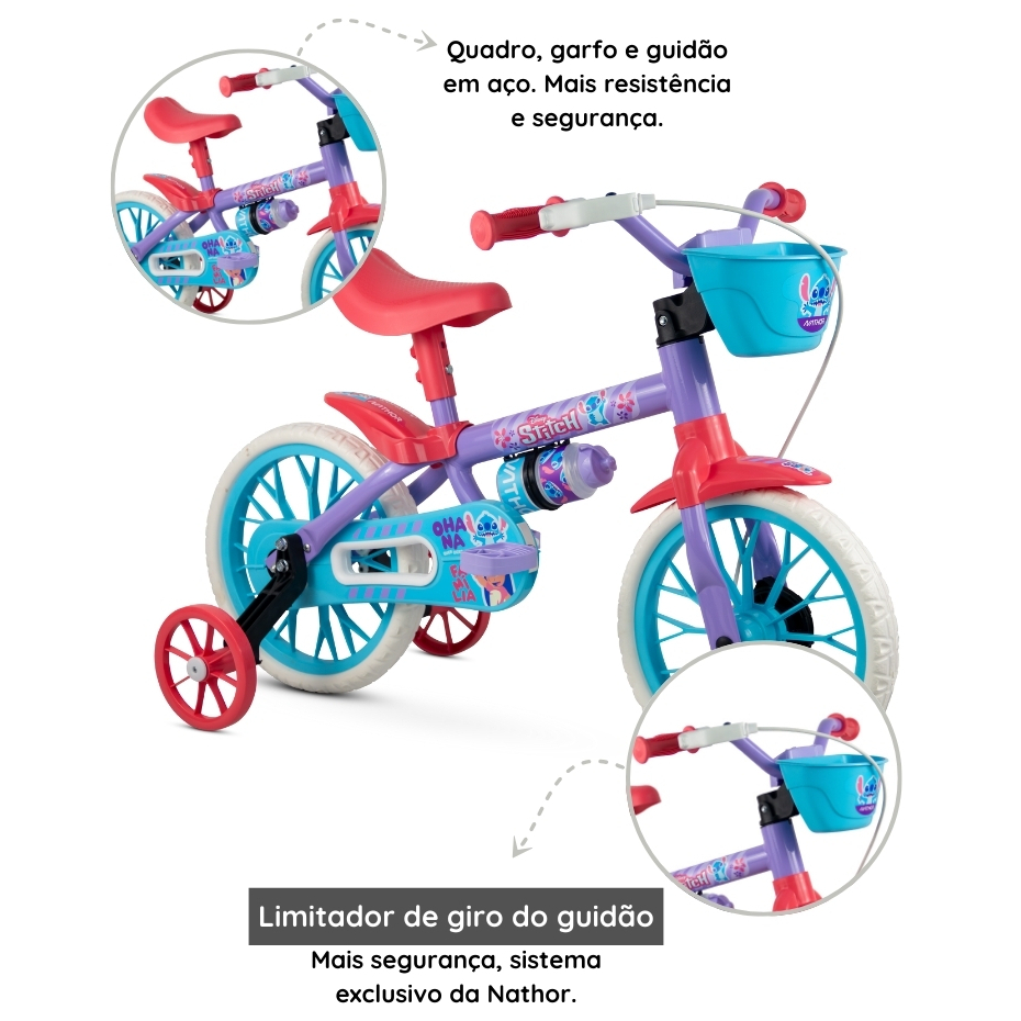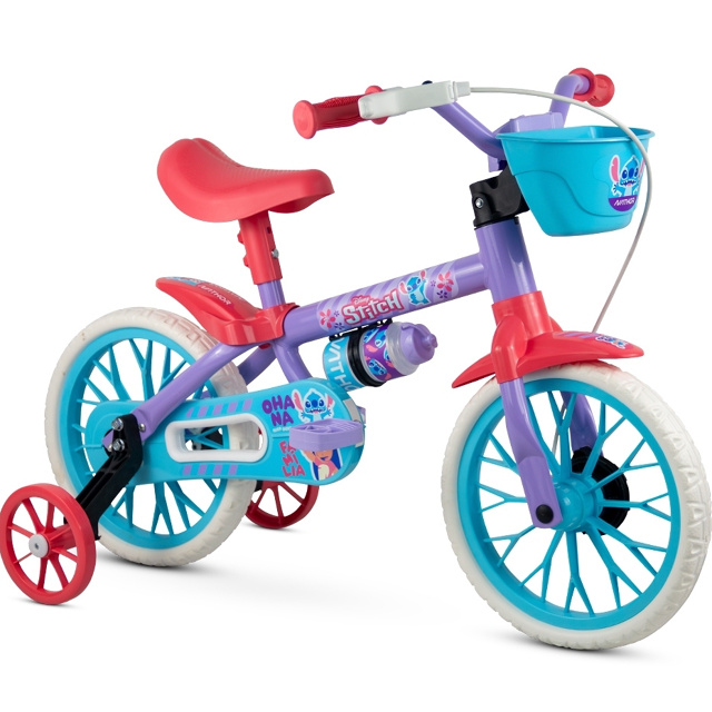 Bicicleta Infantil Aro 12 Stitch C/ Rodinhas de Equilíbrio Garrafinha de Água e Protetor de Corrente