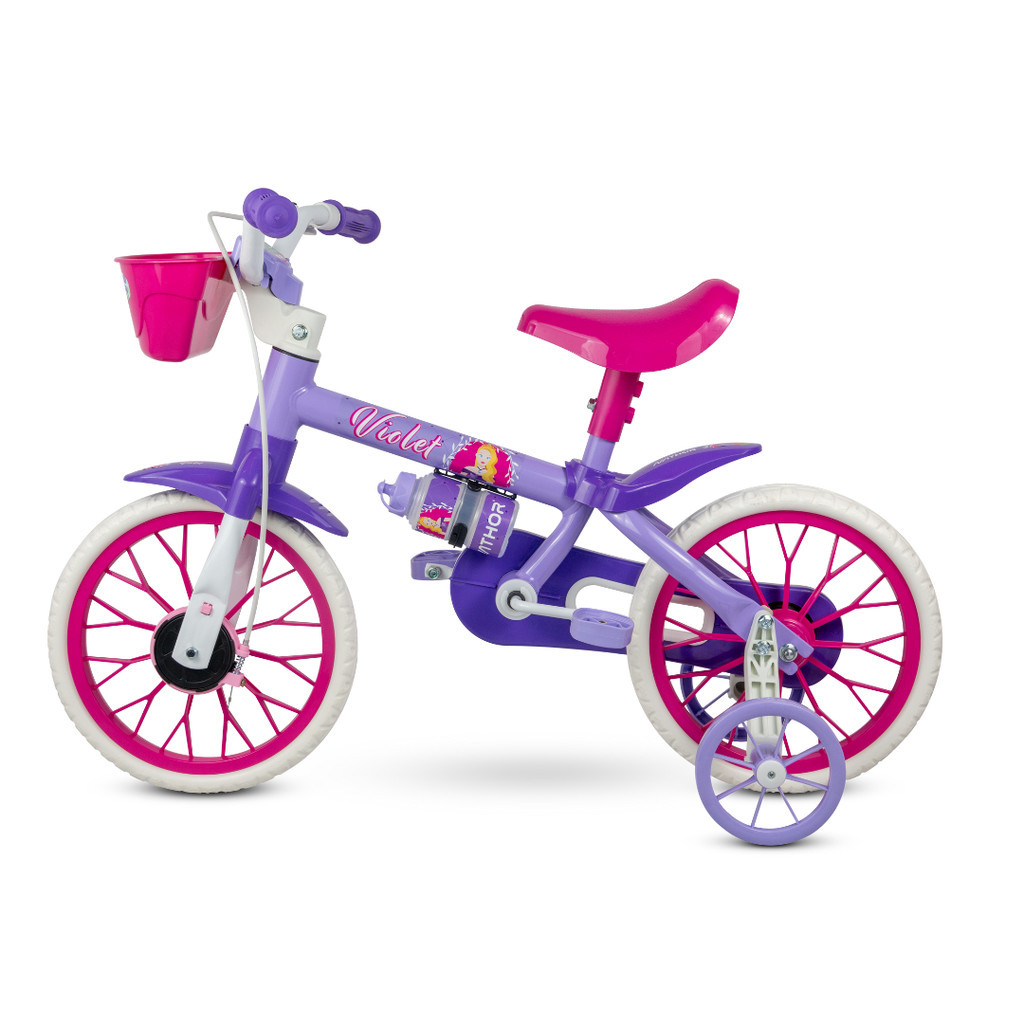 A Bicicleta Aro 12 Violet da Nathor é equipada com os melhores itens de segurança e conforto das crianças. O selim possui regulagem de altura o qual deve ser regulado para que a criança mantém os pés no chão. Desta forma ela se sente mais segura e assim sair pedalando com mais confiança. Possui limitador de giro do guidão, importante característica que evita com que guidão dê uma volta completa e danifique o freio, além de preservar a integridade física da criança. Possui também freio a tambor, garrafinha, pneus em EVA, quadro, garfo e guidão em aço carbono, mesa de direção com regulagem de ângulo, cestinha e cores alegres. Tudo o que a criança precisa para se divertir com segurança e conforto. Características Gerais do Produto: • Altura Recomendada: até 100cm • Cestinha: Sim • Freios: Tambor • Garrafinha: Sim • Idade Mínima Recomendada: A partir de 02 a 05 anos • Material: Aço Carbono • Peso Máximo Recomendado: Até 21kg • Selim com Regulagem de Altura: Sim • Selim em PU: Não • Tamanho do Aro: 12" Garantia: • 3 meses