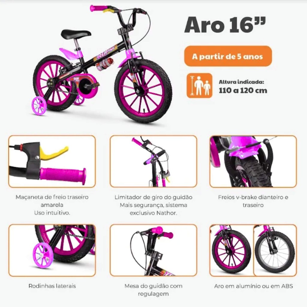 Indicada para crianças a partir de 5 anos ou com altura entre 1,10m e 1,20m. Diversão e aventura com conforto e segurança! O limitador de giro evita que o guidão vire completamente, proporcionando mais segurança e preservando o freio. Para facilitar o aprendizado e a identificação do freio traseiro, a maçaneta amarela ganha destaque e indica o acionamento ideal na hora da frenagem. A aro 16 tem pneus com câmara, quadro em aço carbono e garrafinha. - Cor da Maçaneta do Freio: Durante a infância, a maioria das crianças não tem facilidade em diferenciar “direita” e “esquerda”, mas tem a atenção muito disposta em relação a cores. Para tornar o acionamento do freio traseiro mais intuitivo e garantir ainda mais segurança, decidimos diferenciar a maçaneta direita que com a cor amarela. - Limitador de Giro do Guidão: Mecanismo que impede que o guidão gire mais do que o necessário. O limitador evita acidentes, preserva a integridade dos cabos de freio, permitindo um pedalar com mais segurança e tranquilidade. - Guidão com Regulagem de Ângulo: O ângulo do guidão pode ser ajustado, permitindo um ajuste mais ergonomico de acordo com o tamanho da criança Características desta bike: Quadro, garfo e guidão em aço carbono; Limitador de giro do guidão; Freios V-brake com maçanetas em nylon reforçado e ajuste; Mesa headset com regulagem de ângulo do guidão; Rodinhas laterais; Aro em abs; Pneus com câmara; Para-lamas em ABS; Movimento de direção com esferas; Abraçadeira do selim em alumínio; Garrafinha e Cadeirinha para boneca; Informações Técnicas: Tamanho da roda: 16" Altura máxima recomendada: 110 cm a 120 cm Peso máximo recomendado: 30 kg Peso do produto: 9,500 Kg Peso com a embalagem: 10,740 Kg Dimensões do produto (CxAxL): 107 cm x 69 cm x 53,5 cm Dimensões da embalagem (CxAxL): 97 cm x 48 cm x 23 cm Características: - Marca:NATHOR - Modelo:101360160000 *Imagens Meramente Ilustrativas* Conteúdo da Embalagem: - 01x Bicicleta Aro 16 Barbie - Mattel - Nathor