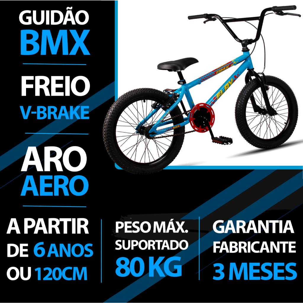 A Bicicleta BMX FLAY Aro 20 é ideal para crianças a partir de 6 anos que adoram aventura e diversão ao ar livre! Com visual radical e estrutura reforçada, ela garante segurança e estilo nas manobras e passeios. Perfeita para criar memórias incríveis na infância com muito movimento e liberdade! Quadro em Aço carbono Guidão em Aço carbono Garfo em Aço carbono Aro Aero em alumínio com parede dupla Freios V-Brake - Nylon Manete em Nylon Mesinha em Alumínio Caixa de Direção Standard Movimento Central 45mm Pedivela Monobloco Coroa 36 Dentes Catraca 18 Dentes Cubos 3/8 36 Furos Pedal simples em Nylon Rosca Fina 1/2 Canote em aço 22.2mm Selim P.U. Manopla em borracha Abraçadeira com porca - Garantia: 3 meses - Necessita montagem (não acompanha ferramentas) - A montagem é responsabilidade do cliente (deve ser feita em oficina especializada) - Peças podem ser diferentes da imagem devido lote de fabricação - A cor do produto pode ser ligeiramente diferente, devido variações de telas. - Peso Suportado: 80kg - Idade Recomendada: A partir de 6 Anos ou (120cm à 145cm) de altura - Não indicado para manobras radicais
