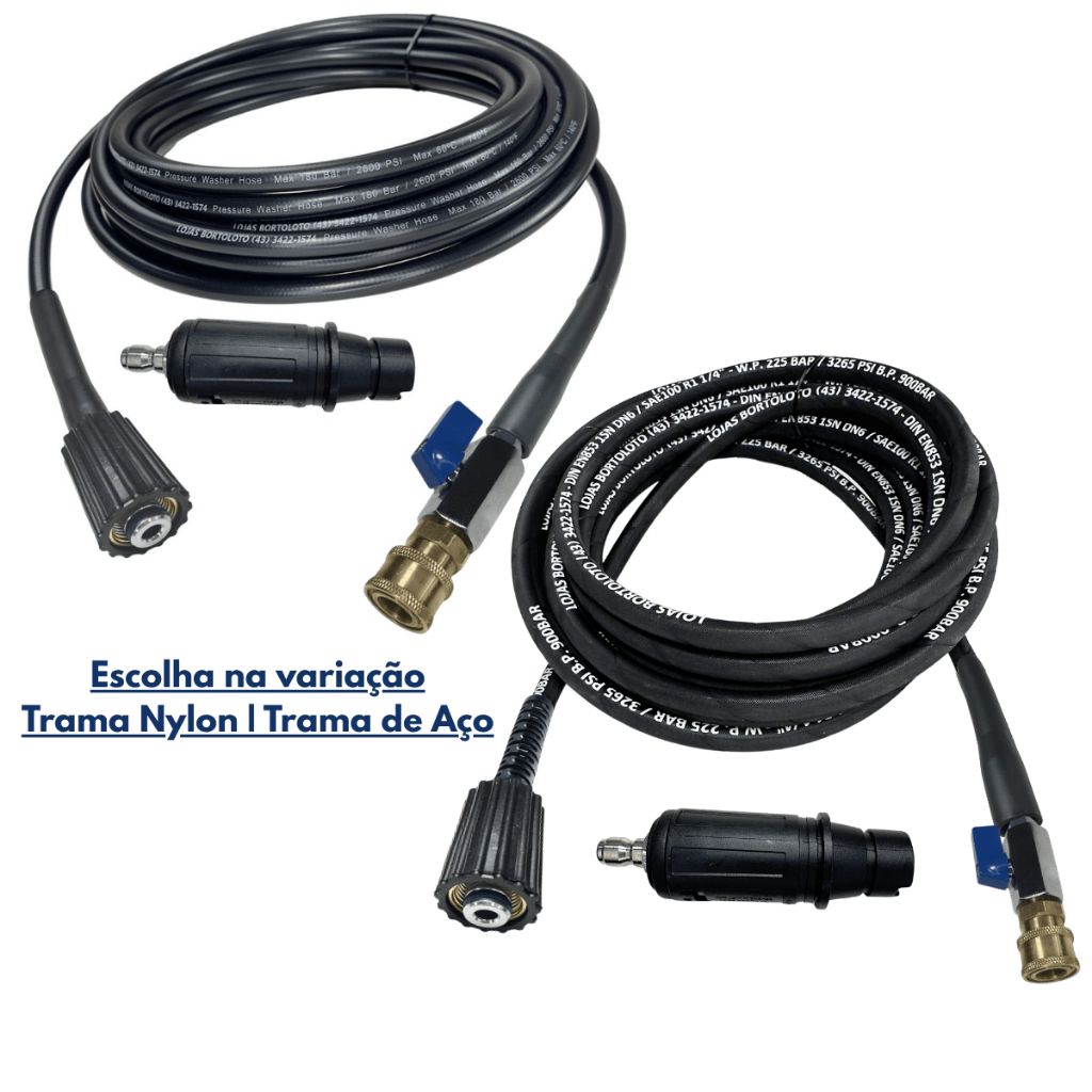 Mangueira trama de Nylon ou Aço com Bico Esguicho Curto Leque Variador de Engate Rápido para Lavagem Automotiva e uso geral. Transforme a limpeza do seu carro com mais eficiência, praticidade e resultado impecável! Essa mangueira com bico esguicho curto e sistema de engate rápido foi desenvolvida especialmente para quem busca rapidez e acabamento profissional em cada lavagem automotiva. ✨ Principais Benefícios e Diferenciais 1.Pressão concentrada ou leque com jato preciso •O bico esguicho curto facilita a lavagem, sendo ideal para: Remover barro de caixas de roda Limpar áreas de difícil acesso com poeira acumulada Eliminar respingos de lama com eficiência •Permite focar a água exatamente onde é necessário, com mais força, economizando tempo e esforço. 2.Engate rápido prático e seguro •Sistema de engate rápido para conexão e desconexão sem esforço. •Evita vazamentos ou perda de pressão. •Agilidade na troca entre esguicho e outros acessórios como Snow Foam (não acompanha). •Ideal para oficinas, lava-rápidos ou uso doméstico. 3.Mangueira trama nylon ou Aço de alta resistência •Material resistente à abrasão, torções e uso contínuo. •Flexível, leve e durável: não dobra facilmente e prolonga a vida útil do sistema. •Ideal para uso intenso em ambientes profissionais ou residenciais. 4.Versatilidade e compatibilidade •Pode ser usada com lavadoras equipadas com canhão de espuma, adaptadores e outros acessórios comuns. •Compatível com diversos modelos de lavadoras WAP (veja lista abaixo). •Perfeita para: Lava-jatos Empresas de estética automotiva Entusiastas do detalhamento automotivo Uso doméstico 5.Economia de água e eficiência energética •Possui registro de fluxo de fácil acesso, que ajuda a utilizar a função Stop-Total da sua lavadora. •Reduz o consumo de água e energia elétrica. •Menos tempo gasto no enxágue, com resultado mais eficaz e sustentável. 🧰 Compatibilidade Confirmada ✅ Lavadoras: HD 585 (modelo 220V) •Tipo de bico: Esguicho curto ajustável de engate rápido (regulável leque) •Material do bico: Latão / Plástico Reforçado / Inox • Sistema de engate rápido: Padrão ¼" BSP •Pressão de trabalho compatível: Até 2600 PSI 📦 Itens Inclusos •1x Mangueira trama Nylon ou Aço reforçado • 1x Bico esguicho curto variador • 1x Registro de fluxo embutido • 1x Engate rápido de alta vedação 💡 Dica de Uso Para melhores resultados na lavagem automotiva: 1.Regule o jato no bico variador: Jato fino para sujeiras pesadas Jato leque para enxágue uniforme 2.Aplique sabão ou espuma e deixe agir por 1 a 2 minutos 3.Enxágue com jato aberto e constante 4.Finalize com pano seco ou flanela para acabamento ⭐ Avaliações ajudam muito! Se gostou do produto, avalie com 5 estrelas e envie uma foto! Isso nos motiva a continuar oferecendo qualidade com preço justo. Muito obrigado! 🙏