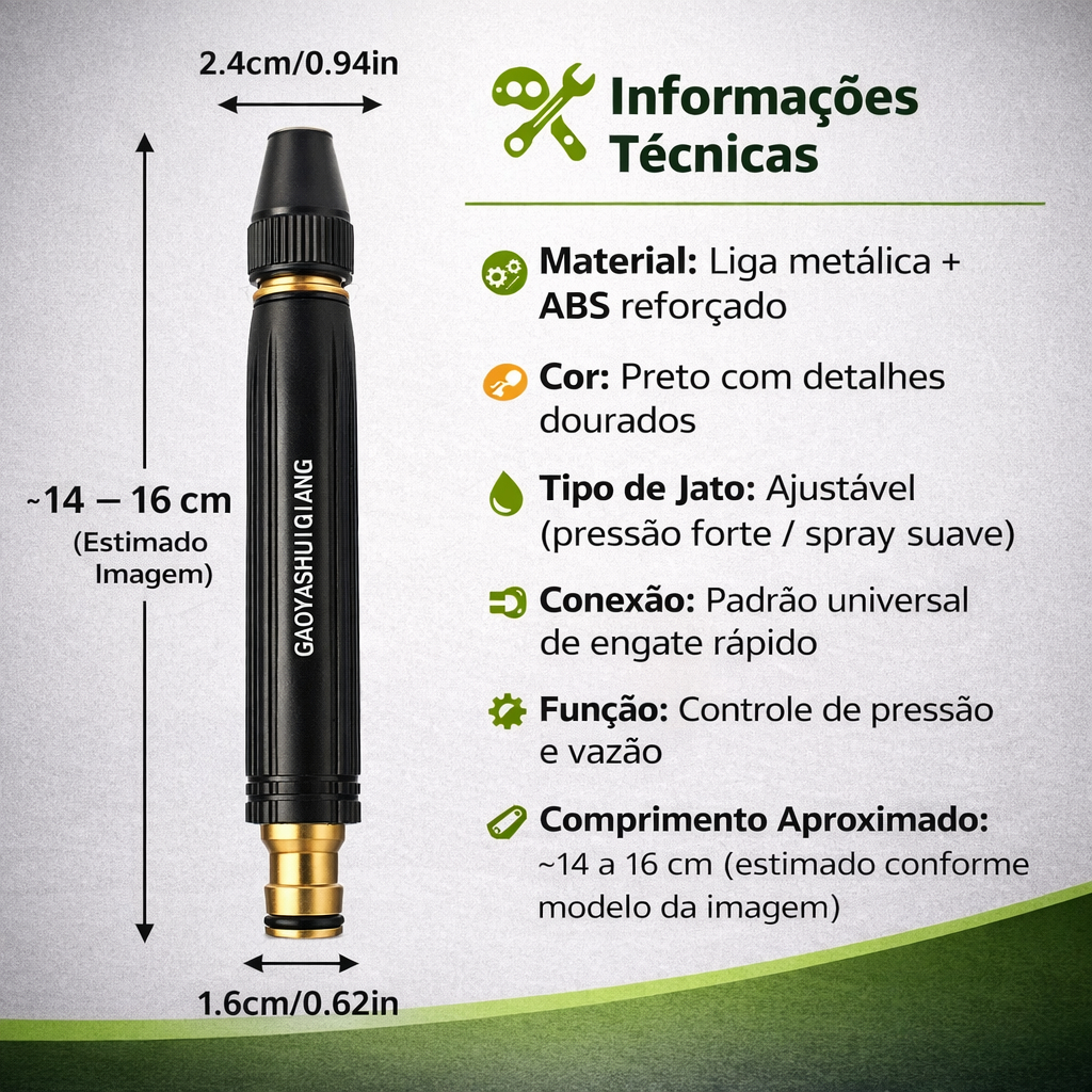 Bico Esguicho de Alta Pressão Ajustável Para Mangueira – Jato Forte, Econômico e Durável 🚿 Transforme sua mangueira comum em um jato de alta pressão! O Esguicho Regulável Alta Pressão permite controlar totalmente o fluxo de água, desde um jato forte para limpeza pesada até uma névoa suave para regar plantas. Ideal para: ✔ Lavar carro ✔ Limpar quintal ✔ Regar jardim ✔ Remover sujeiras difíceis Benefícios: • Ajuste fácil girando a ponta • Economia de água • Encaixe rápido e prático -Material: Liga metálica + ABS reforçado -Cor: Preto com detalhes dourados -Tipo de jato: Ajustável (pressão forte / spray suave) -Conexão: Padrão universal de engate rápido -Funções: Controle de pressão e vazão -Comprimento: Aproximadamente 16,7 cm Especificações: Material: Liga metálica + revestimento reforçado Compatível com mangueiras padrão Produto testado antes do envio. Principais Vantagens -Pressão de água potente – Ideal para remover sujeiras pesadas com facilidade -Regulagem ajustável – Alterne entre jato fino e spray amplo girando a ponta -Economia de até 70% de água – Controle inteligente de vazão e precisão no uso -Corpo resistente e durável – Produzido em liga metálica + ABS de alta densidade -Conexão universal – Compatível com qualquer mangueira padrão de engate rápido -Uso versátil – Perfeito para carros, motos, jardins, calçadas e áreas externas -Atenção é necessário que a pressão de agua da torneira seja forte para o melhor resutado. -Limpeza profunda com jato concentrado -Jato suave ideal para regar plantas sem causar danos -Encaixe firme e seguro, sem vazamentos -Design ergonômico e acabamento premium -Resistente à ferrugem, à pressão e ao tempo Conteúdo da Embalagem 1x Bico Esguicho de Alta Pressão Ajustável Perguntas Frequentes (FAQ) -Serve em qualquer mangueira? Sim! Possui encaixe padrão universal de engate rápido. -Posso ajustar o tipo de jato? Sim. Basta girar a ponta do bico para escolher entre jato fino ou spray. -Ele realmente aumenta a pressão? Ele não cria pressão artificial, mas concentra o fluxo de água, deixando o jato muito mais forte e eficiente. bico de alta pressão, esguicho ajustável, lavar carro, mangueira de jardim, bico esguicho potente, jato forte, economia de água, bico metálico, limpeza externa, irrigação, lavadora portátil, bico universal, bico para mangueira, bico reforçado.