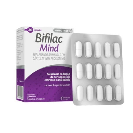 Bifilac Mind – Suporte emocional e saúde intestinal em uma cápsula! Bifilac Mind é um suplemento alimentar com a cepa probiótica exclusiva Lactobacillus plantarum DR7, associada ao suporte do bem-estar mental e equilíbrio intestinal. Classificado como psicobiótico, ele atua no eixo intestino-cérebro, contribuindo para a saúde emocional, especialmente em momentos de estresse cotidiano. ✅ Benefícios (atualizados): Pode auxiliar na resposta ao estresse do dia a dia Contém a cepa Lactobacillus plantarum DR7 Suporte à microbiota intestinal e ao equilíbrio emocional Prático: 1 cápsula ao dia Suplemento sem glúten e de uso adulto