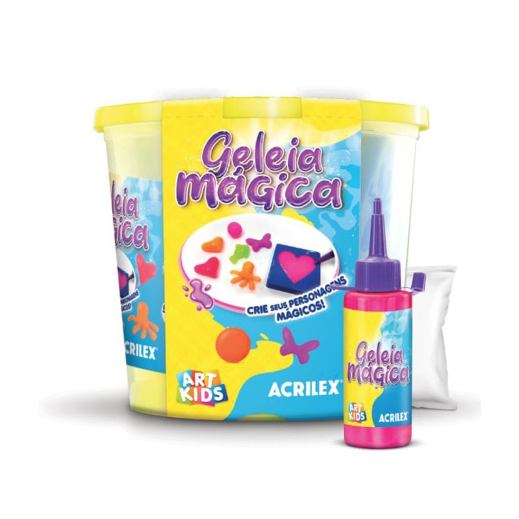 GELEIA MÁGICA A experiência sensorial que vai encantar as crianças com magia, cores e textura suave e gelatinosa. Faça o seu próprio Squishy com a combinação de cores que quiser, e veja que incrível a geleia mágica se transformando de líquida para sólida. Contém: Balde com Tampa! - 7 Moldes Plásticos Figuras Sortidas; - 4 Geleias Mágicas 60ml(4 cores); - 2 Pó Mágico 20g. Passo a Passo: 1- Adicionar 1 litro de água no recipiente, após adicione 20gr de pó mágico (1 pacote) e mexa com auxílio de uma colher até que o pó mágico seja dissolvido; 2- Umedeça o molde na água que está com o pó mágico; 3- Adicione a geleia mágica no molde que foi umedecido. Podendo misturar as cores entre si; 4- Mergulhe o molde com a geleia mágica na solução, agite para a esquerda e para a direita até que a geleia mágica se desprenda totalmente do molde; 5- Deixe a geleia mágica já formada, mergulhada na solução por no mínimo 5 minutos para que a película em sua volta fique consistente; 6- Em seguida, coloque-a em água limpa por 20 minutos para que a figura tenha seu tamanho aumentado. - Não mancha as mãos. - Não comestível. - Não Tóxico Idade recomendada: +3 anos. Composição: Água, Espessante, Pigmentos, Conservantes e Aditivos.