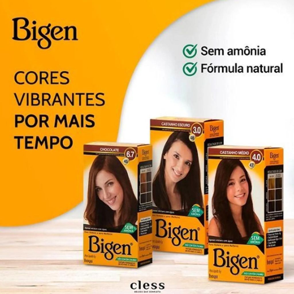 Kit Bigen Tintura Permanente Em Pó Para O Cabelo Escolha a Sua - Cless Bigen Tintura Permanente em Pó é uma coloração capilar que não contém amônia nem água oxigenada, formulada para cobrir 100% dos cabelos brancos, proporcionando cor duradoura, brilho e hidratação. O produto é preparado misturando o pó com água para formar uma pasta. É importante seguir as instruções da embalagem, especialmente a respeito do tempo de ação, que pode variar, e o uso do bálsamo condicionador após o enxágue. Principais características Sem amônia e água oxigenada: A fórmula sem amônia e água oxigenada, ao contrário de outras tinturas, não danifica os fios, proporcionando brilho intenso sem desbotar facilmente. Cobertura total de brancos: Garante uma cobertura 100% dos fios brancos, com alto poder de fixação. Ação e resultado: Promove cor vibrante, intensa, duradoura e com aparência natural, além de hidratação. Base de água: O produto é ativado pela adição de água, formando uma pasta cremosa. Bálsamo condicionador: O kit inclui um bálsamo condicionador para ser aplicado após a lavagem, que deve agir por 3 minutos antes de enxaguar.