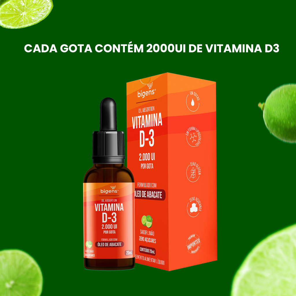 Biogens agora é Bigens! Descubra a eficiência da Vitamina D3 em gotas da Bigens, formulada em óleo de abacate com sabor limão. Nossa fórmula lipossolúvel garante uma absorção rápida e eficaz. Cada gota fornece 2000 UI de Vitamina D3, essencial para a saúde óssea, fortalecimento do sistema imunológico, manutenção da função muscular e bem-estar geral. O produto é zero açúcares, zero glúten, vegano, e utiliza matéria-prima importada. Com 400 porções de 1 gota por frasco, oferece um excelente custo-benefício. Ingerir 1 gota por dia, preferencialmente junto a uma refeição para melhor absorção. Agitar antes de usar. A Vitamina D3 é fundamental para a absorção de cálcio, ajudando a manter ossos e dentes fortes. Ela fortalece o sistema imunológico, protegendo contra infecções, contribui para a saúde cardiovascular, melhora o humor e o bem-estar geral, e ajuda na manutenção da função muscular adequada. Nossa fórmula em gotas torna o consumo diário prático e agradável, com um delicioso sabor de limão.