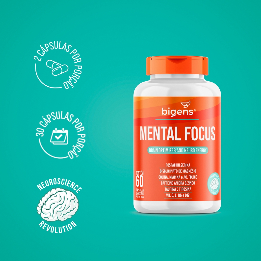 Biogens agora é Bigens! MENTAL FOCUS BRAIN OPTIMIZER AND NEURO ENERGY 60 CÁPSULAS Mental Focus Bigens é um suplemento formulado especialmente com substâncias que, apesar de potencializar o desempenho cognitivo, não são tóxicas ou viciantes. Praticantes de exercício físico possuem suplementos para o upgrade físico bem como praticantes de atividades mentais também podem se favorecer com suplementos para um upgrade mental. Mental Focus Bigens pode ser considerado um nootrópico, já que possui em sua composição nutrientes essenciais e biodisponíveis além de um composto ativo estimulante que colabora para um estado de alerta e atenção. Sua fórmula carrega doses eficientes de fosfatidilserina, cafeína, zinco quelato, colina, taurina, tirosina, ácido fólico, vitaminas C, E e do complexo B. Vitamina C (ácido ascórbico): é um antioxidante que auxilia na proteção dos danos causados pelos radicais livres, auxilia na absorção de ferro dos alimentos, no funcionamento do sistema imune, na formação do colágeno e na regeneração da forma reduzida da vitamina E. Niacina: também conhecida como niacinamida ou ácido nicotínico é uma substância encontrada no composto hidrossolúvel Vitamina B, mais especificamente, a B3. Sua síntese costuma ser insuficiente em humanos e, além disso, não temos a capacidade de armazená-la. Por esse motivo, a ingestão diária através da alimentação ou suplementação é fundamental. Essa vitamina auxilia no metabolismo de proteínas, carboidratos e gorduras, no metabolismo energético, na manutenção de mucosas, além de contribuir para a manutenção da pele. Vitamina B6: pode ser chamada de piridoxina, é um micronutriente que desempenha diversas funções no organismo, como por exemplo, auxiliar na síntese de cisteína, no metabolismo de proteínas e do glicogênio, no metabolismo de carboidratos e gorduras, no funcionamento do sistema imune, no metabolismo de homocisteína e na formação das células vermelhas do sangue. Vitamina B12: conhecida como metilcobalamina (B12 em sua forma biodisponível) no corpo. Essa vitamina auxilia na formação de células vermelhas do sangue, no funcionamento do sistema imune, no metabolismo energético, no metabolismo dos carboidratos, proteínas e gorduras, no metabolismo da homocisteína além de auxiliar no processo de divisão celular. A deficiência de vitamina B12 no organismo humano pode vir a gerar mudanças de ordem psiquiátrica, neurológica, hematológica, e gastrintestinal, podendo assim ser considerada a mais importante dentre as vitaminas do complexo B. Zinco: auxilia no metabolismo da vitamina A, na síntese de proteínas, no processo de divisão celular, na manutenção de ossos, contribui para a manutenção do cabelo, da pele e das unhas além de ser um antioxidante que auxilia na proteção dos danos causados pelos radicais livres. Como o revestimento das células nervosas é feito por gorduras cujas sínteses dependem do zinco, esse elemento é simplesmente essencial para o funcionamento e para a comunicação entre os neurônios. INGREDIENTES: Bisglicinato de magnésio, tirosina, ácido ascórbico, niacina (nicotinamida), acetato de D-alfa-tocoferol (vitamina E), cloridrato piridoxina (vitamina B6), metilcobalamina (vitamina B12), sulfato de zinco, bitartarato de colina, taurina, fosfatidil serina, cafeína, ácido fólico. INGREDIENTES DA CÁPSULA: Gelatina, corante inorgânico clorofila, opacificante INS 171 e umectante água potável filtrada. NÃO CONTÉM GLÚTEN. SUGESTÃO DE USO: Adultos 19 anos, Ingerir 2 cápsulas ao dia após o café da manhã, ou conforme a orientação de médico ou nutricionista. Conservar este produto bem fechado, em lugar fresco, seco e ao abrigo da luz. Após aberto consumir em até 90 dias.