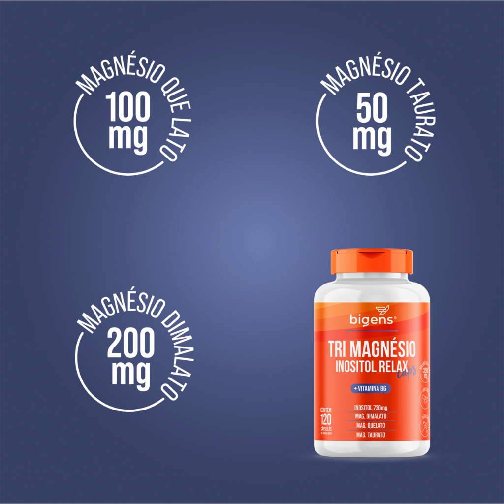 Biogens agora é Bigens! Conheça o Tri Magnésio Inositol Relax CAPS, uma combinação cuidadosamente formulada de magnésio dimalato, quelato e taurato. Este trio de magnésio oferece um total de 350mg de magnésio elementar, complementado com 730mg de Inositol e 50mg de Vitamina B6. Se você já é um apreciador da nossa versão em pó, vai ficar feliz em saber que agora você pode escolher entre as duas opções, de acordo com as suas preferências e necessidades. Esta fórmula foi criada pensando em você, que busca uma opção de alta qualidade e conveniência para o seu bem-estar diário. As cápsulas são a escolha ideal para quem valoriza praticidade sem comprometer a eficácia. Cada dose diária de 4 cápsulas é livre de corantes artificiais, alinhando-se com nosso compromisso de oferecer opções mais naturais para você. Além disso, um único frasco contém 120 cápsulas, o que garante 30 porções, tornando este suplemento uma escolha completa e duradoura para o seu dia a dia. INGREDIENTES: Inositol, Malato de magnésio, Bisglicinato de magnésio, Taurato de magnésio e Cloridrato de piridoxina. Diluente: Amido de milho. Estabilizante: Celulose microcristalina. Antiumectante: Dióxido de silício e estearato de magnésio. Composição da cápsula: Água purificada, gelatina e umectante glicerina. ALÉRGICOS: PODE CONTER CRUSTÁCEOS. NÃO CONTÉM GLÚTEN. SUGESTÃO DE USO: Ingerir 2 cápsulas pela manhã e 2 cápsulas a tarde ou conforme orientação profissional. PRODUTO INDICADO PARA O GRUPO POPULACIONAL ≥ 19 ANOS. Este produto não é um medicamento. Não exceder a recomendação diária de consumo indicada na embalagem. Mantenha fora do alcance de crianças. Não consumir este produto caso o lacre de segurança esteja violado. Manter o frasco hermeticamente fechado. ESTE PRODUTO NÃO DEVE SER CONSUMIDO POR GESTANTES, LACTANTES E CRIANÇAS. CONSERVE AO ABRIGO DA LUZ, CALOR E UMIDADE. APÓS ABERTO CONSUMIR EM ATÉ 60 DIAS. Suplemento Alimentar dispensado de registro conforme Resolução RDC nº 240/2018. A BIOGENS AGORA É BIGENS ! UM NOVO NOME, A MESMA QUALIDADE !
