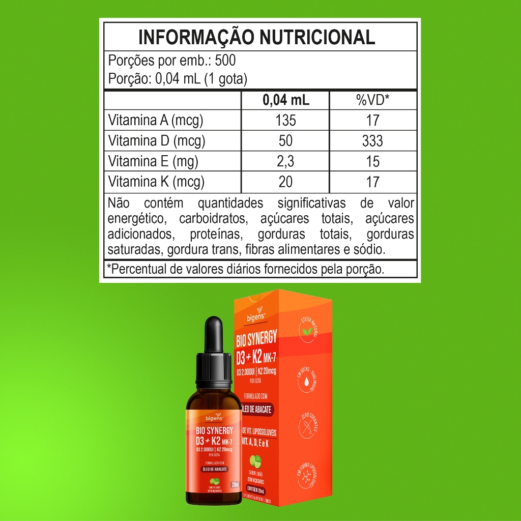 Kit Bigens Bio Synergy D3+K2 MK-7 + Metil B-12 Sublingual – 2×20 mL Complemente sua saúde com o poder das vitaminas lipossolúveis e do complexo B em gotas oral! Ideal para quem busca praticidade, alta absorção e benefícios completos: 📦 Conteúdo do Kit Bio Synergy D3 + K2 MK-7 (20 mL) 2.000 UI de Vitamina D3 + 20 mcg de Vitamina K2 MK-7 por gota Base em óleo de abacate para melhor biodisponibilidade Vitaminas A & E adicionadas (saúde ocular, imunológica e da pele) Sabor limão — até 500 doses por frasco Metil B-12 Sublingual (20 mL) Metilcobalamina (413% VD*) em gotas — forma ativa e de rápida absorção Uso oral: 1 gota/dia — dispensa metabolização Apoia produção de glóbulos vermelhos, saúde neurológica e metabolismo energético Sabor frutas vermelhas, sem glúten e sem açúcares 🔑 Principais Benefícios do Kit Fortalecimento Ósseo & Imunológico: D3 + K2 em sinergia para absorção de cálcio e proteção cardiovascular. Alta Absorção: Fórmulas lipossolúveis e oral garantem 50–70% mais biodisponibilidade. Energia & Sistema Nervoso: B-12 ativa otimiza metabolismo de carboidratos, proteínas e gorduras. Praticidade: Dose diária em gotas, sem cápsulas; ótimo custo-benefício. ⚙️ Como Usar D3+K2: 1 gota via oral, aguardar 30 s e engolir – 1× ao dia. B-12: 1 gota via oral, aguardar 30 s e engolir – 1× ao dia.