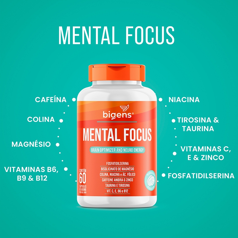 Biogens agora é Bigens! VALIDADE LONGA: MÍNIMO DE 1 ANO E 6 MESES - PRODUTO SELADO _______________________________________________________________ KIT COMPOSTO POR MENTAL FOCUS E +BRAIN DA BIGENS MENTAL FOCUS 60 CÁPSULAS INGREDIENTES Bisglicinato de magnésio, tirosina, ácido ascórbico, niacina (nicotinamida), acetato de D-alfa-tocoferol (vitamina E), cloridrato piridoxina (vitamina B6), metilcobalamina (vitamina B12), sulfato de zinco, bitartarato de colina, taurina, fosfatidil serina, cafeína, ácido fólico. INGREDIENTES DA CÁPSULA: Gelatina, corante inorgânico clorofila, opacificante INS 171 e umectante água potável filtrada. NÃO CONTÉM GLÚTEN SUGESTÃO DE USO Tomar 2 cápsulas de Mental Focus BIOGENS após o café da manhã com água ou conforme recomendações de um profissional de saúde INFORMAÇÃO NUTRICIONAL Presente nas imagens +BRAIN 60 CÁPSULAS INGREDIENTES L-triptofano, Bisglicinato de Magnésio (Magnésio), Bitartarato de Colina (Colina), Nicotinamida (Niacina), D-Pantotenato de Cálcio (Ácido Pantotênico), Fosfato Piridoxal (Vitamina B6), Cianocobalamina (Vitamina B12) e Veiculo (Óleo de Linhaça); Cápsula: Água Purificada, Geleificante (Gelatina), Umectante (INS 422) e Corantes (INS 171, INS 133, INS 129). NÃO CONTÉM GLÚTEN. SUGESTÃO DE USO Tomar 1 cápsula de +Brain L-Triptofano 2 vezes ao dia com água ou conforme recomendações de um profissional de saúde. INFORMAÇÃO NUTRICIONAL Presente nas imagens _______________________________________________________________