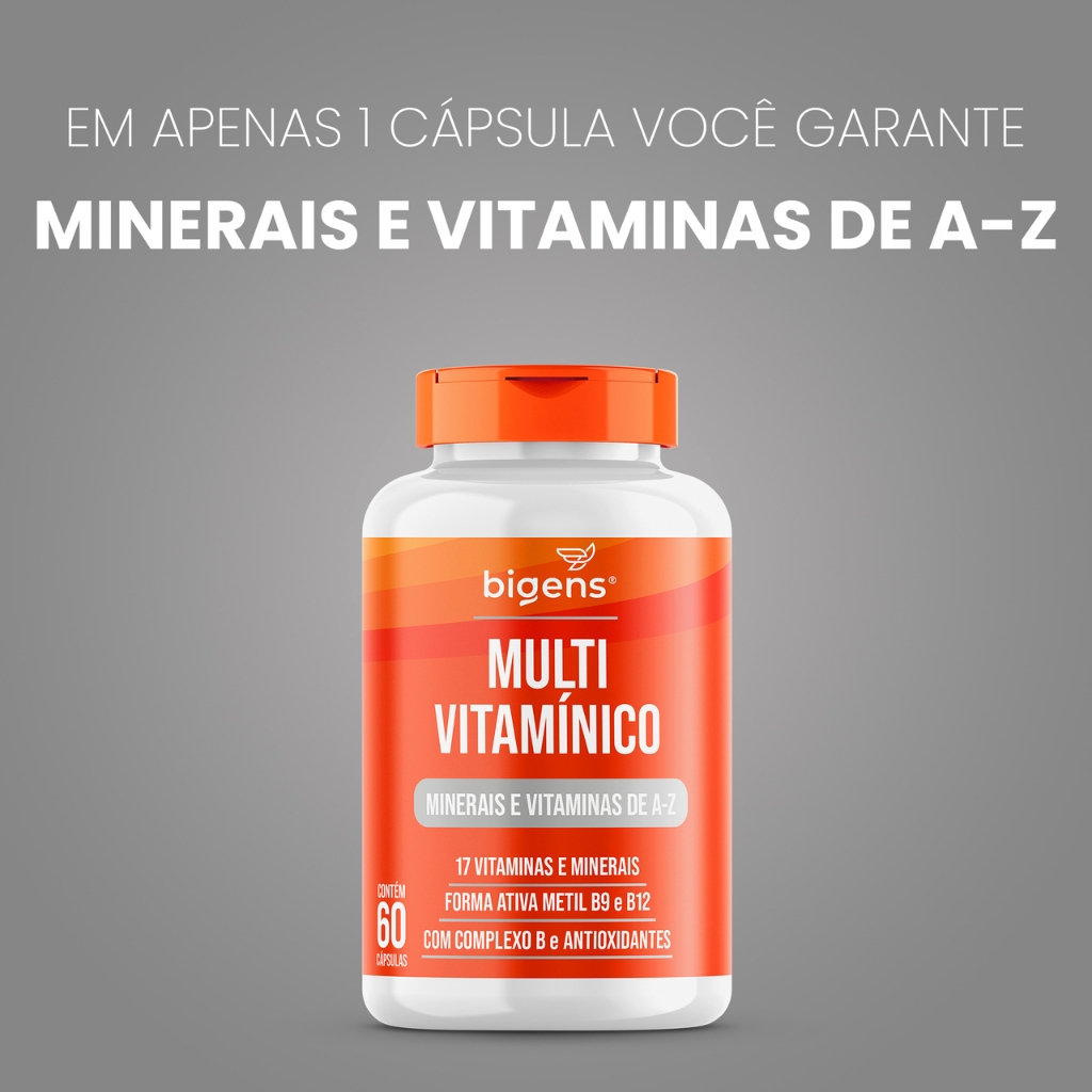 Biogens agora é Bigens! O Multivitamínico A-Z Bigens é a escolha ideal para quem busca uma suplementação completa e eficaz. Desenvolvido com uma combinação poderosa de 17 vitaminas e minerais essenciais, este multivitamínico oferece tudo o que seu corpo precisa para manter-se equilibrado e saudável. Com formas ativas de B9 e B12, que garantem melhor absorção e aproveitamento dos nutrientes, além de um Complexo B integrado e antioxidantes, cada cápsula foi cuidadosamente formulada para atender às suas necessidades diárias. Prático e fácil de incluir na sua rotina, o Multivitamínico A-Z Bigens vem em uma embalagem com 60 cápsulas, garantindo dois meses de suporte nutricional de alta qualidade. Ideal para quem deseja promover o bem-estar de maneira eficiente e conveniente. Instruções para consumo: Ingerir 1 (uma) cápsula ao dia.