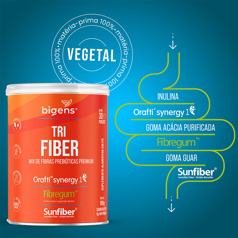 Biogens agora é Bigens! Apresentamos o TRI Fiber, o suplemento alimentar de fibras prebióticas da Biogens, uma revolução no cuidado com a sua saúde intestinal. Este produto foi especialmente formulado para auxiliar o funcionamento do seu intestino, promovendo um estilo de vida saudável e equilibrado. TRI Fiber é feito de matéria-prima 100% vegetal, totalmente vegano, tornando-o uma excelente escolha para aqueles que seguem uma dieta livre de ingredientes de origem animal. A fórmula do Bio Fiber conta com o exclusivo Fibergum ®, uma Goma Acácia patenteada reconhecida pela sua alta tolerância digestiva e pela capacidade de promover um equilíbrio saudável da microbiota intestinal, ORAFIT SINERGY 1 e SunFiber. Estes ingredientes fornecem uma ótima quantidade de fibras alimentares para o seu organismo. Suplemento Alimentar dispensado de registro conforme Resolução RDC nº 240/2018.