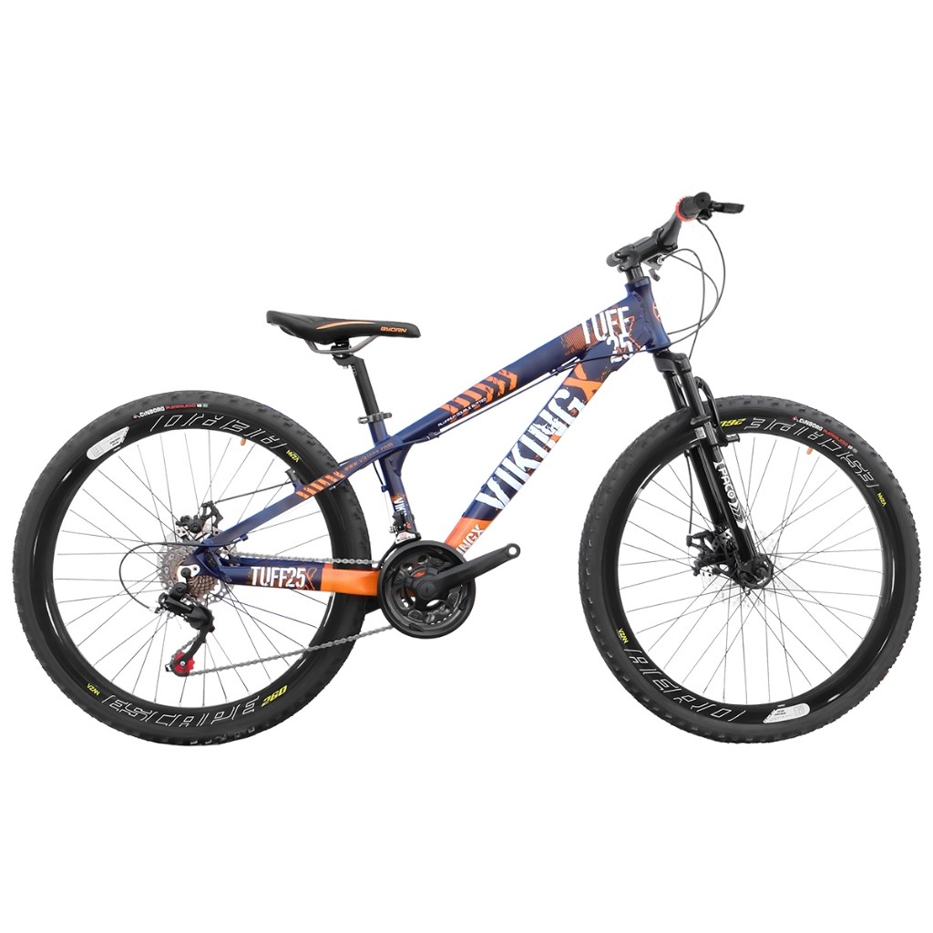 **ATENÇÃO PRODUTO ENVIADO DESMONTADO!** Bem vindo a Dias Bike! A Dias Bike é uma loja física e virtual que faz parte da família Dias Bike e Dias Moto Peças, que possuem mais de 10 lojas físicas e uma distribuidora atacadista, atuando no mercado de ciclismo a mais de 31 anos. A empresa comercializa bicicletas prontas, peças e acessórios para bicicletas em geral, tudo a sua disposição e com a comodidade de receber o produto em sua casa em qualquer lugar do Brasil com toda garantia de entrega e a certeza de sua satisfação. Esse modelo da Viking Tuff foi idealizado para crianças, trazendo um ótimo kit de transmissão para passeios urbano ideal para ir a escola ou se divertir com os amigos. O quadro Viking Tuff 25 conta com perfil rebaixado que facilita a subir na bicicleta, também gerando maior segurança por ficar mais facil para colocar os pés no chão. COMPONENTES DA BIKE *NÃO ACOMPANHA CONDUITE E ESPASSADORES* *PNEU SLICK OU CRAVO CONFORME DISPONIBILIDADE DO ESTOQUE* - Quadro aro 26 Alumínio Viking Tuff X25 Em Alumínio - Suspensão de 80mm - Aros Parede Dupla em Alumínio - Raios Zincados Pretos - Pneus Aro 26 Com Arame - Camara de ar 26 Bico Grosso - Jogo Direção Ahead Set - Suporte Do guidão 75 a 90mm - Guidão 680 a 700 mm - Canote do Selim em Alumínio - Pedal em Plataforma Comum - Arruela Calço para Ahead Set (3 unidades) - Manopla - Abraçadeira do Selim com Blocagem - Selim - Disco de Freio De 160mm 6 Parafusos - Freio a Disco Hidráulicos com Pastilha RELAÇÃO (TRANSMISSÃO DA BIKE) - Roda Livre 8 Velocidades - Pedivela Roda tripla em Aço Encapado 3V - Trocador - Cambio Dianteiro 3V Top Pull - Cambio Traseiro 8V - Cubos Sistema Rosca esferado - Corrente 8 Velocidades - Jogo de Centro Blindado