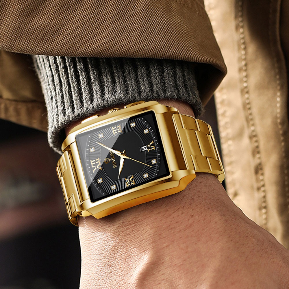 Binbon relógio masculino quadrado dourado e preto, à prova d'água, luminoso, aço inoxidável,quartzo