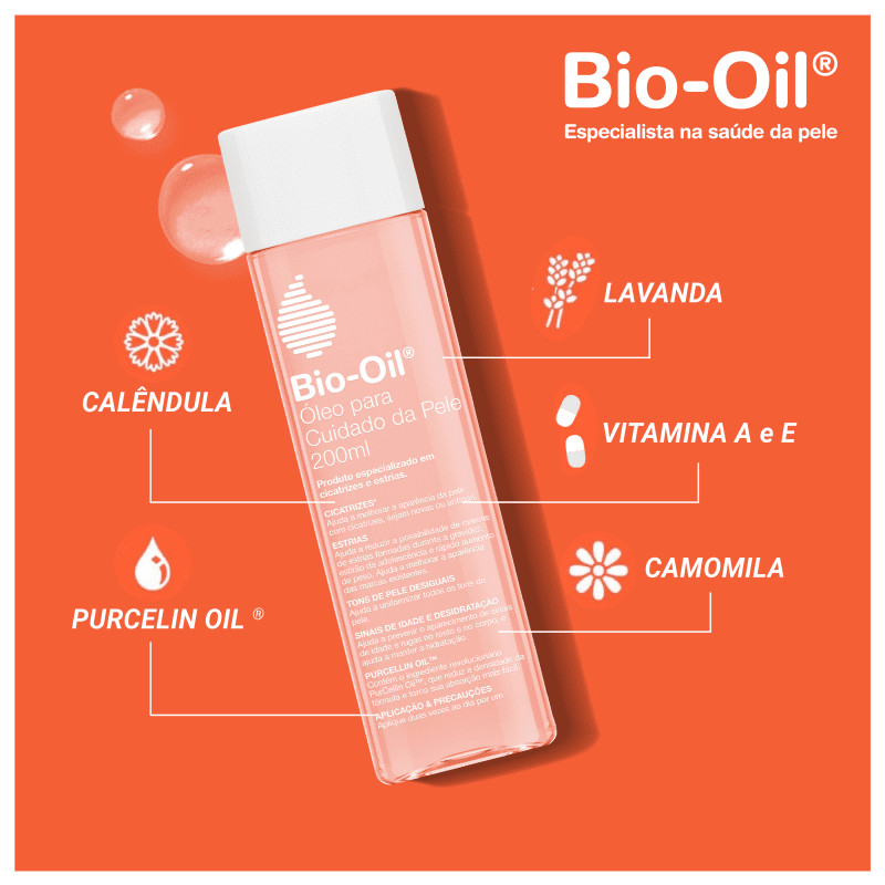 Bio-Oil é um óleo restaurador para corpo e rosto, que oferece cuidados especiais com a pele, ajudando a melhorar a aparência da pele com cicatrizes, estrias, tons de pele desiguais, sinais de idade e desidratação. Sua fórmula rica em extratos de plantas e vitaminas, suspensa numa base de óleo, nutre e hidrata profundamente a pele, com uma textura leve e não gordurosa, assegurando que os benefícios das vitaminas e dos extratos de plantas sejam facilmente absorvidos. Benefícios: - Melhora a aparência de estrias e cicatrizes; - Melhora a aparência dos tons de pele desiguais; - Hidrata, melhora a textura, o tom e a aparência de linhas finas e rugas; - Ajuda a restaurar a função da barreira de retenção da umidade. Modo de usar: Aplique Bio-Oil duas vezes ao dia sobre a área afetada, massageando suavemente em movimentos circulares até a completa absorção do produto. Em cicatrizes, estrias e tons de pele desiguais, o produto deve ser aplicado durante um mínimo de 3 meses. Durante a gestação, deve ser aplicado desde o início do segundo trimestre em áreas que sejam propensas a estrias, tais como o abdômen, seios, costas, quadris, glúteos e coxas.