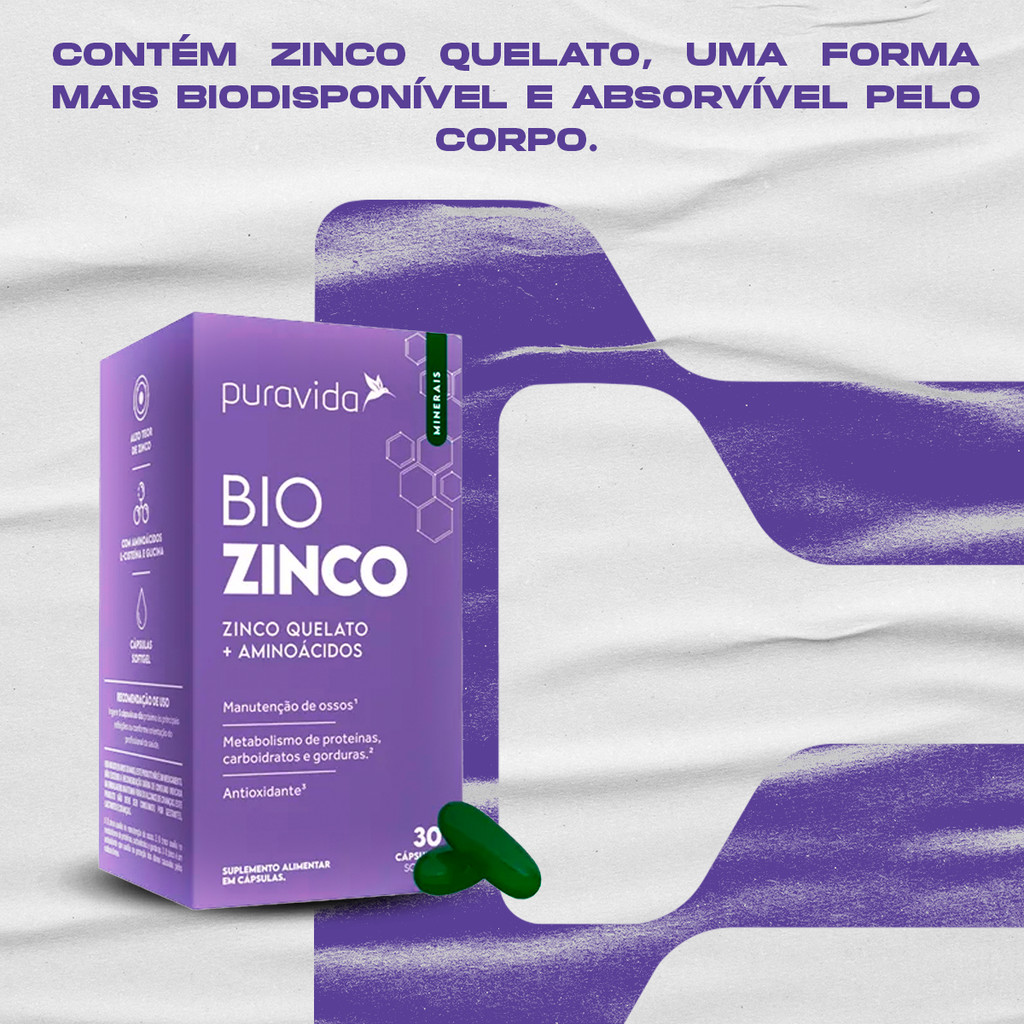 INFORMAÇÕES DE DESTAQUE • Suplemento Alimentar em Cápsulas; • Zinco Quelato; • Aminoácidos. DESCRIÇÃO O zinco é um mineral essencial para diversas funções vitais do organismo, incluindo o fortalecimento do sistema imunológico, a cicatrização de feridas e a regulação hormonal. Para garantir que você obtenha a quantidade adequada deste nutriente, a Puravida desenvolveu um suplemento com zinco quelato, uma forma altamente biodisponível, que facilita sua absorção pelo organismo. Este suplemento também é enriquecido com aminoácidos que colaboram para a síntese proteica e contribuem para o bom funcionamento do metabolismo. A escolha ideal para quem busca qualidade e saúde de forma prática e eficiente. COMPOSIÇÃO Cápsula (gelatina, água purificada, umectante glicerina e corante natural clorofilina cúprica), óleo de girassol, bisglicinato de zinco, óleo de coco, L-cisteína, glicina, emulsificante lecitina e estabilizante cera de abelha. ALÉRGICOS: Pode conter* soja, leite, peixes, ovos, amendoim, amêndoa, avelãs, castanha-de-caju, castanha-do-pará, macadâmias, nozes, pecãs, pistaches, pinoli, castanhas, crustáceos (krill e caranguejo), trigo, centeio, cevada, aveia e suas estirpes hibridizadas. CONTÉM GLÚTEN. *Traços podem ser encontrados devido ao compartilhamento de equipamento no processo produtivo. SUGESTÃO DE USO Ingerir 1 cápsula ao dia, de preferência próximo às principais refeições, ou conforme orientação de um profissional de saúde. Manter o produto bem fechado, em local fresco e seco, ao abrigo da luz solar. “Este produto não é um medicamento.” “Não exceder a recomendação diária de consumo indicada na embalagem.” “Mantenha fora do alcance de crianças.”