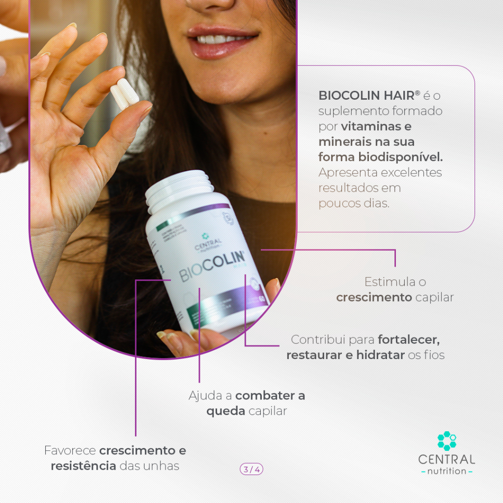 Você está sofrendo com queda de cabelo ou unhas quebradiças? O Biocolin Hair é a solução perfeita para nutrir seu cabelo e unhas de dentro para fora. Composto por cisteína, vitaminas e minerais essenciais, este suplemento da Central Nutrition vai te ajudar a recuperar a força e vitalidade, proporcionando mais beleza e saúde ao seu dia a dia. - Fórmula Completa: Contém vitaminas do complexo B, C, A e D, essenciais para o crescimento saudável do cabelo e fortalecimento das unhas. - Combate à Queda de Cabelo: Cisteína, componente essencial da queratina, ajuda a reduzir a queda e promover o crescimento capilar. - Antioxidante Poderoso: Vitaminas E e selênio protegem o cabelo e unhas dos danos causados pelos radicais livres. - Colágeno e Elasticidade: Silício orgânico auxilia na síntese e estabilização do colágeno, proporcionando mais resistência e elasticidade. - Sem Glúten e Vegano: Produto 100% vegano, sem glúten e sem lactose, ideal para diversos tipos de dieta. Mais Características do Produto: - Auxilia na saúde do cabelo e das unhas: Nutre profundamente, promovendo o fortalecimento e o crescimento saudável. - Fonte de Biotina e L-Cisteína: Contribui para a manutenção da saúde capilar e a estrutura das unhas. - Antioxidante poderoso: Protege contra os danos oxidativos, auxiliando na preservação da juventude dos fios e unhas. - Fácil de consumir: Cápsulas práticas para incluir na sua rotina diária de beleza. - Sabor Natural: Sabor neutro que não interfere no seu dia a dia. Modo de Uso: Adultos a partir de 19 anos: ingerir 1 cápsula duas vezes ao dia ou conforme orientação de um profissional de saúde. Agradecemos por escolher o Biocolin Hair da Central Nutrition! Esperamos que este produto te ajude a alcançar seus objetivos de beleza e saúde, garantindo um cabelo mais forte e unhas mais saudáveis. Qualquer dúvida, estamos à disposição! ESTE PRODUTO NÃO É UM MEDICAMENTO. NÃO EXCEDER A RECOMENDAÇÃO DIÁRIA DE CONSUMO INDICADA NA EMBALAGEM. MANTENHA FORA DO ALCANCE DE CRIANÇAS. ESTE PRODUTO NÃO DEVE SER CONSUMIDO POR GESTANTES, LACTANTES E CRIANÇAS.